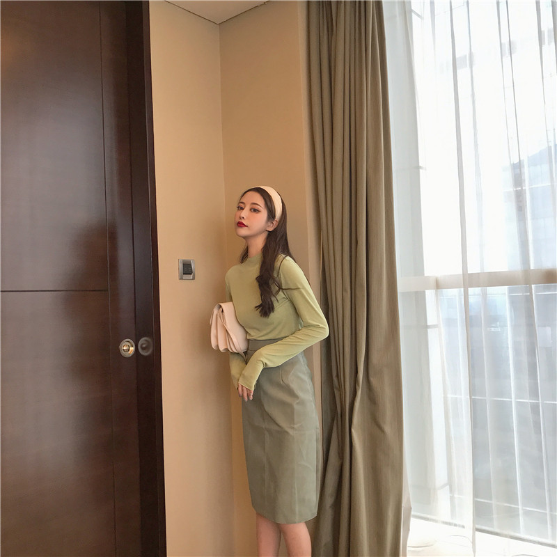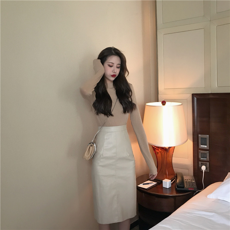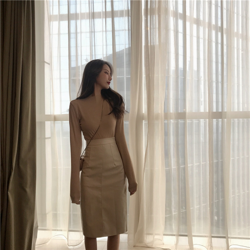 秋裝女2018新款套裝復古簡約基礎立領T恤+高腰顯瘦中長款半身皮裙