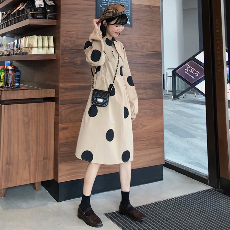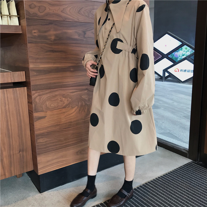 秋裝女2018新款韓版chic風大波點長袖連衣裙學生時尚中長A字裙子