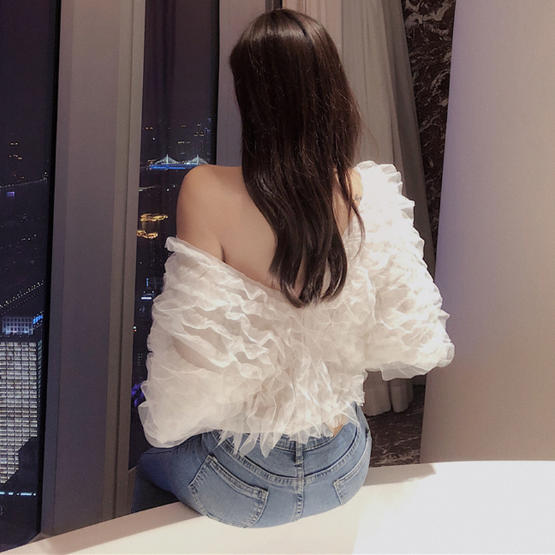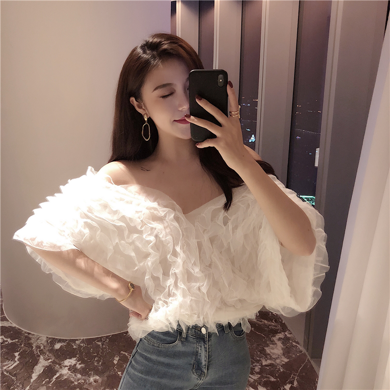 夏季女裝新款氣質波浪花邊V領露肩短袖上衣百搭時尚微透雪紡衫女