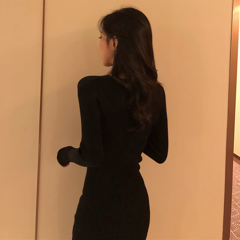 / 港味修身顯瘦包臀裙秋裝女2018新款V領長袖針織裙氣質中長連衣裙