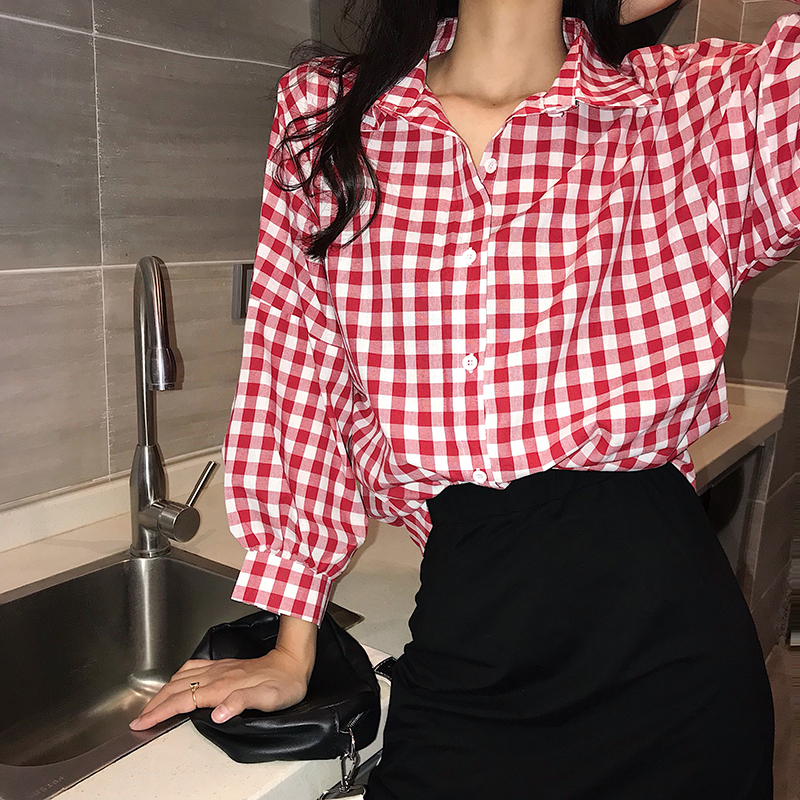 / 秋冬女裝2018新款韓版時尚翻領格子襯衣中長款寬松蝙蝠長袖襯衫潮