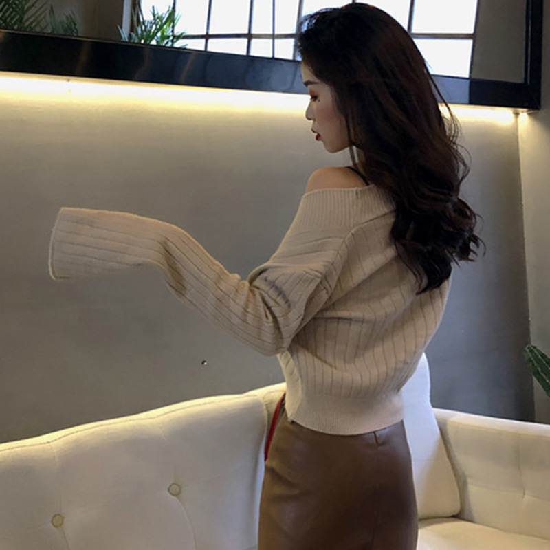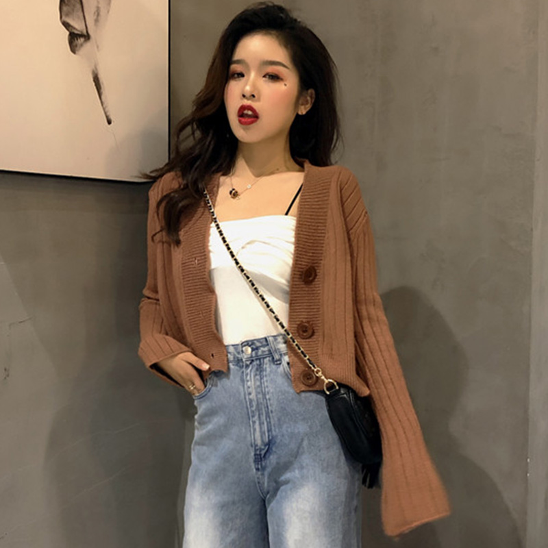早秋韓版上衣慵懶復古溫柔坑條V領一排扣喇叭袖百搭針織開衫外套
