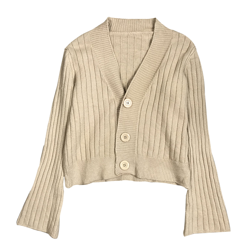 / 早秋韓版上衣慵懶復古溫柔坑條V領一排扣喇叭袖百搭針織開衫外套