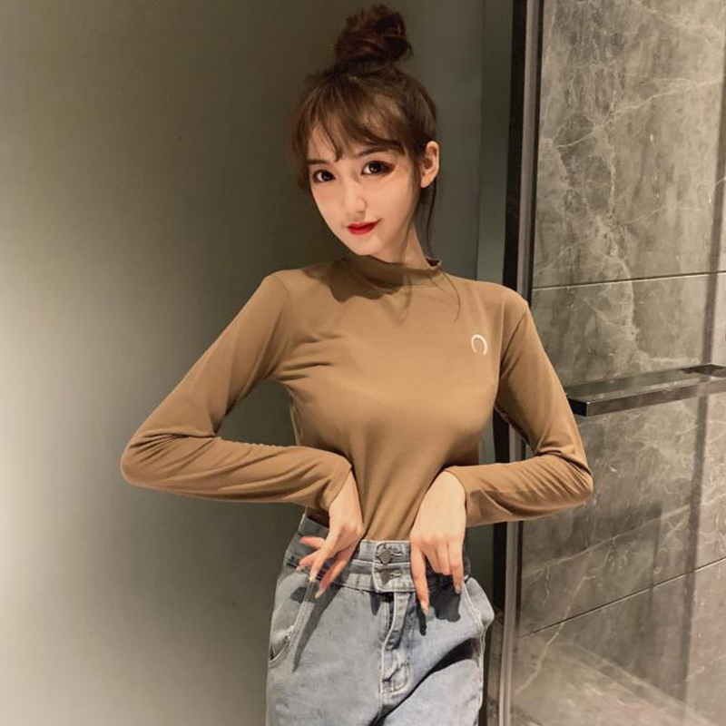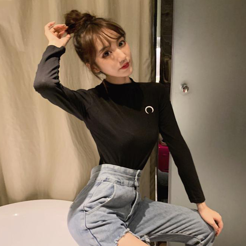 / 半高領長袖打底衫女修身顯瘦刺繡白T恤上衣秋裝新款學生體恤衣服