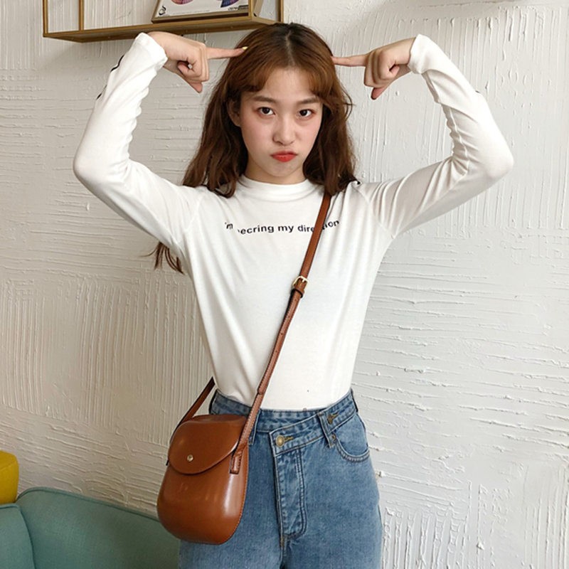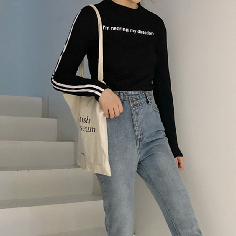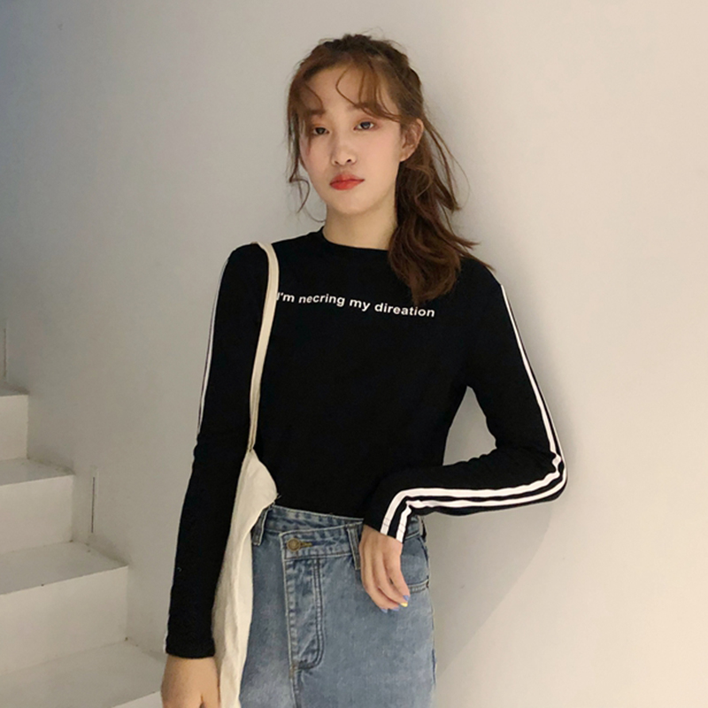 字母印花長袖t恤打底衫女修身顯瘦圓領上衣秋裝新款學生條紋體恤