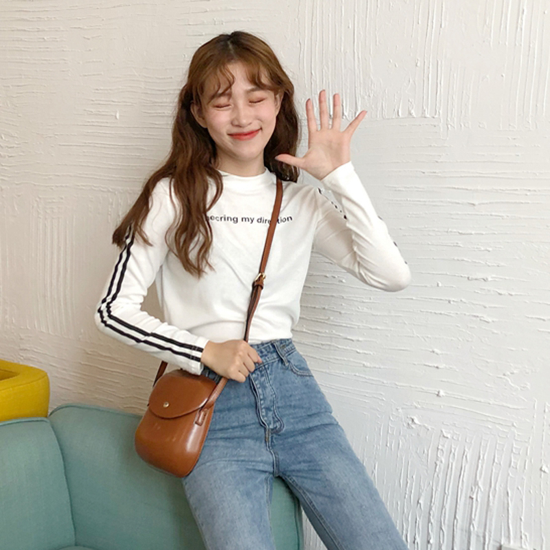 / 字母印花長袖t恤打底衫女修身顯瘦圓領上衣秋裝新款學生條紋體恤