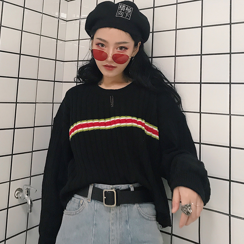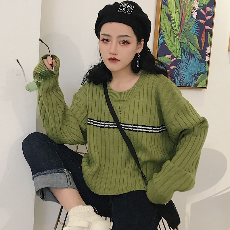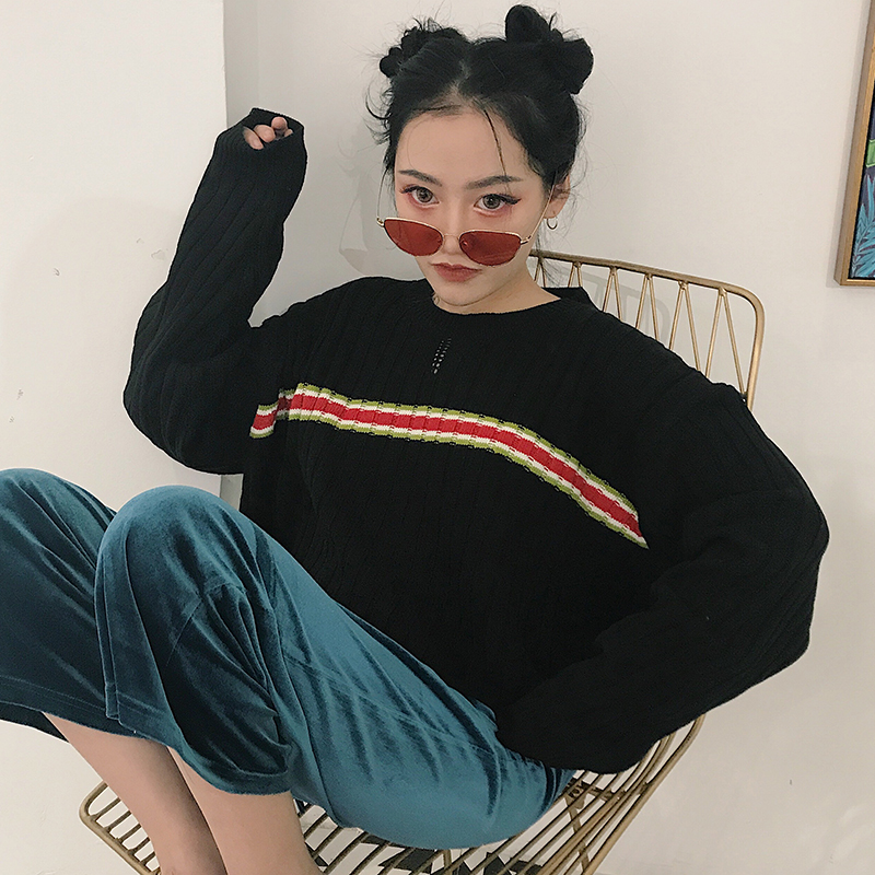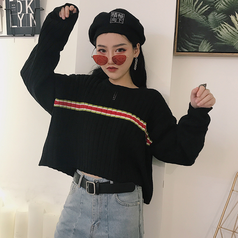 時尚條紋短款毛衣女秋冬裝2018新款寬松慵懶針織外套學生長袖上衣