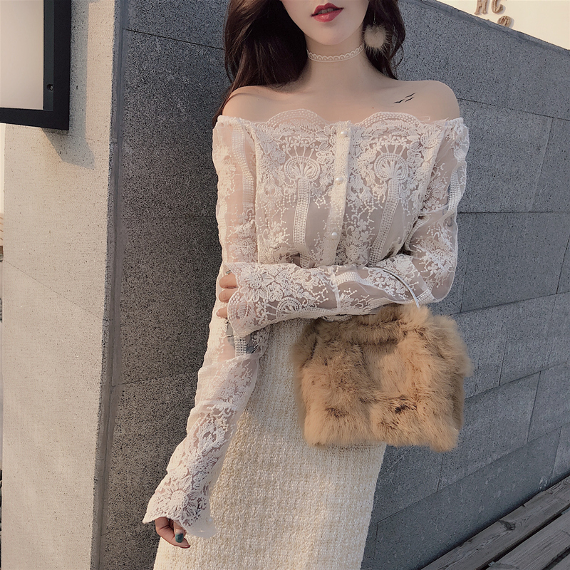 復古韓國chic風性感透視蕾絲鏤空高領顯瘦透視網紗喇叭袖內搭上衣