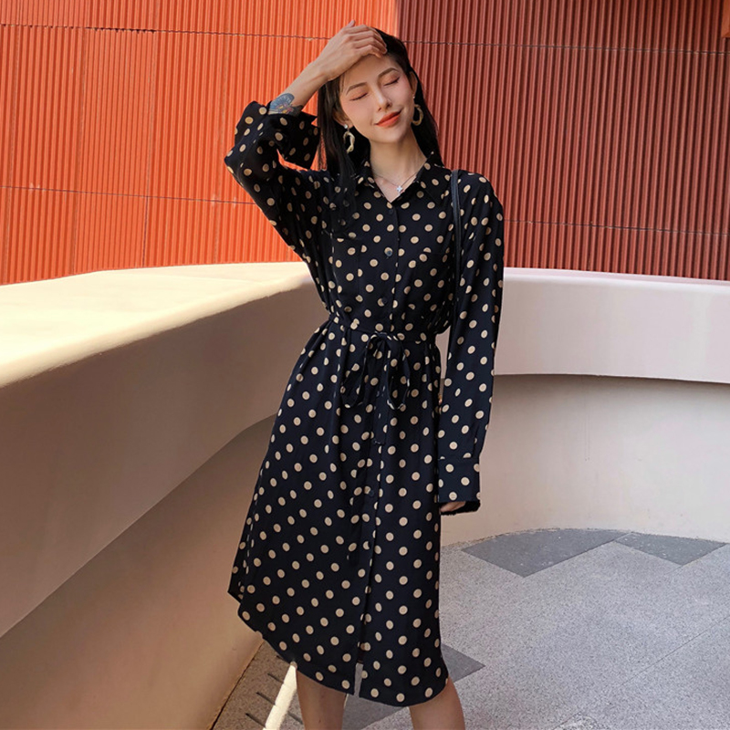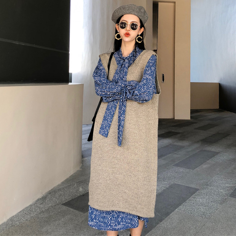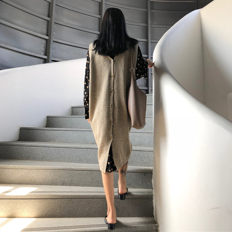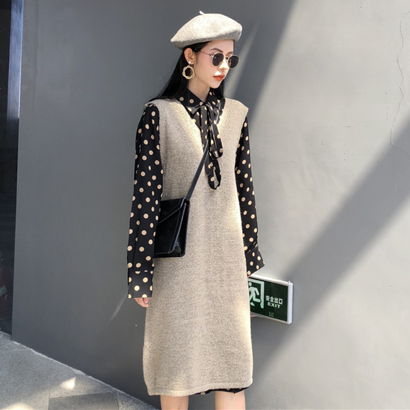 / 洋氣套裝女2018秋冬新款復古波點連衣裙子中長款寬松V領針織外套