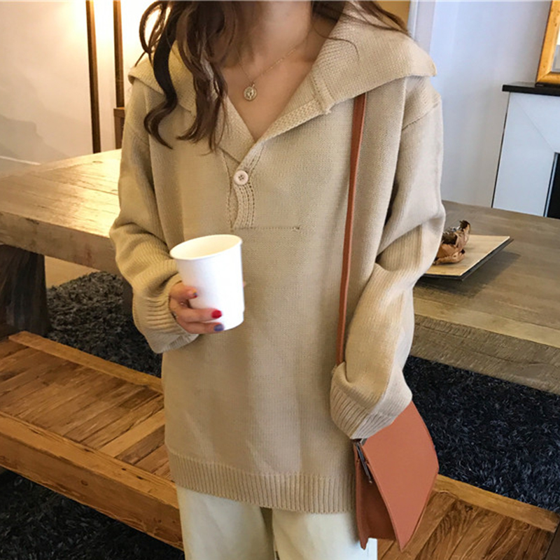 / 翻領寬松長袖毛衣女秋冬裝2018新款慵懶針織外套學生時尚白色上衣
