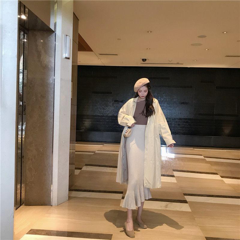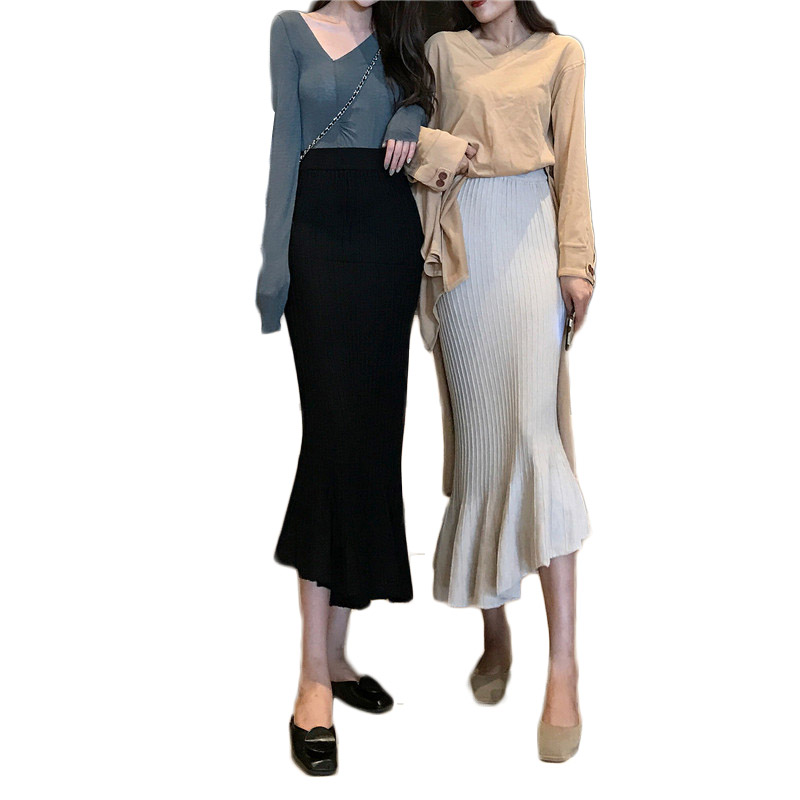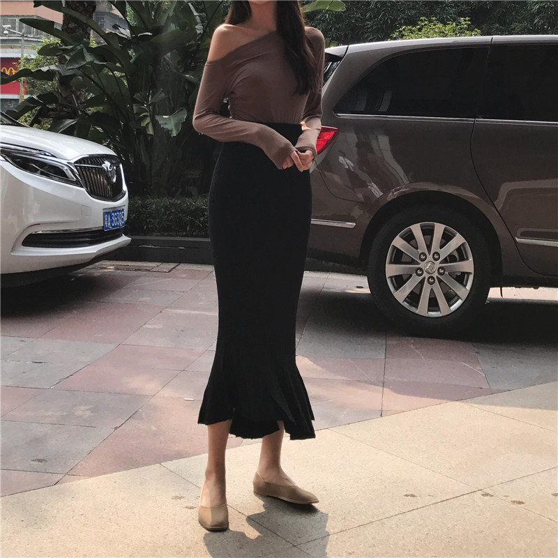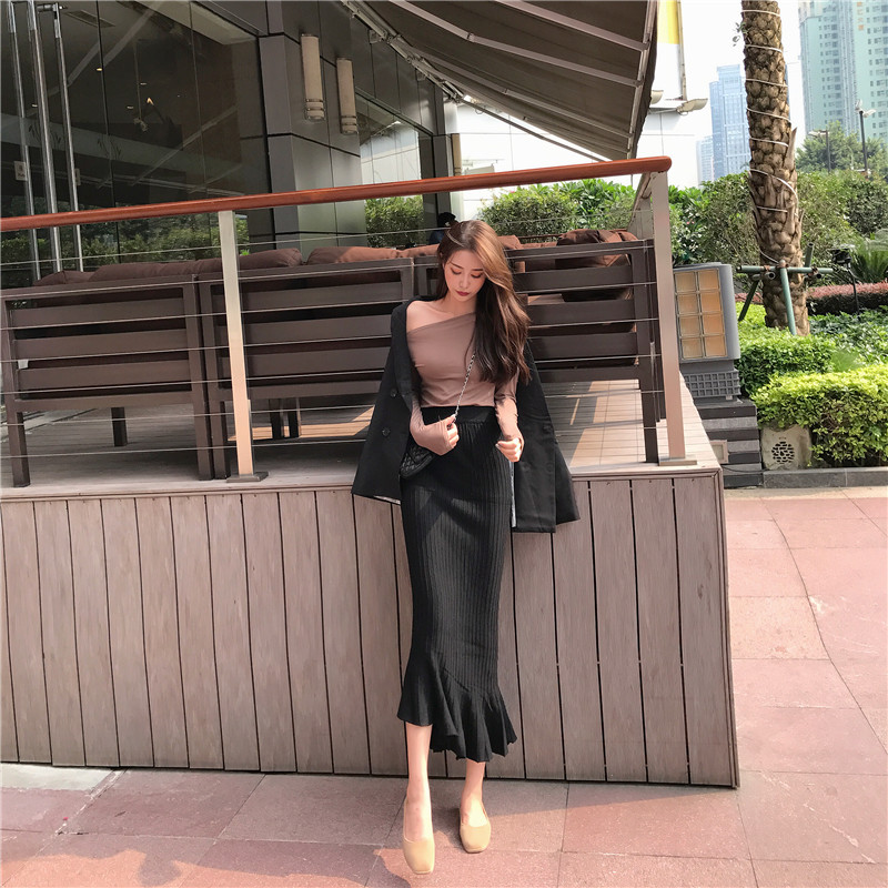 秋裝女2018新款時尚百搭韓版修身顯瘦中長款純色針織魚尾半身裙潮