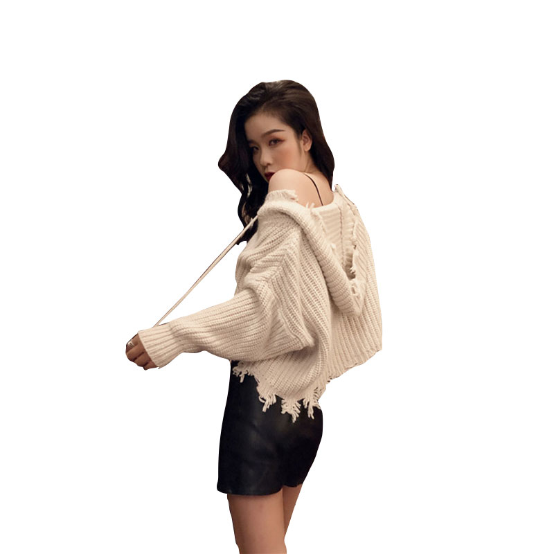 時尚復古秋裝女2018新款溫柔顯瘦連帽開衫拉鏈短款流蘇破洞毛衣潮
