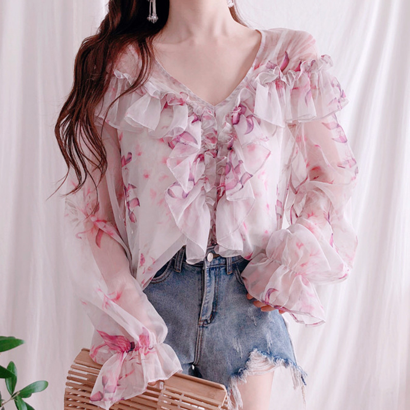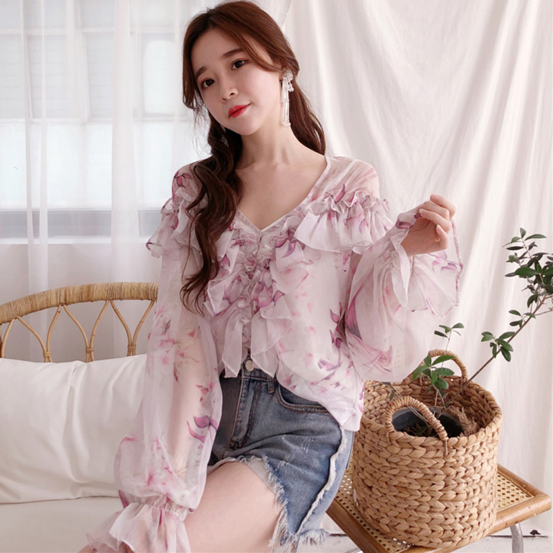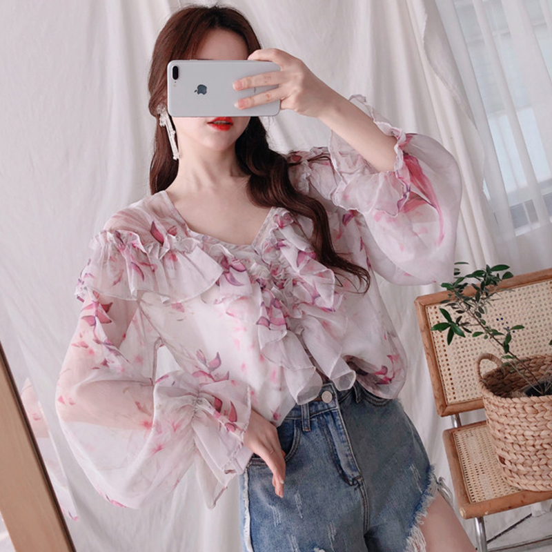 / 氣質套裝女2018夏季新款女裝韓版寬松顯瘦V領燈籠長袖碎花雪紡衫