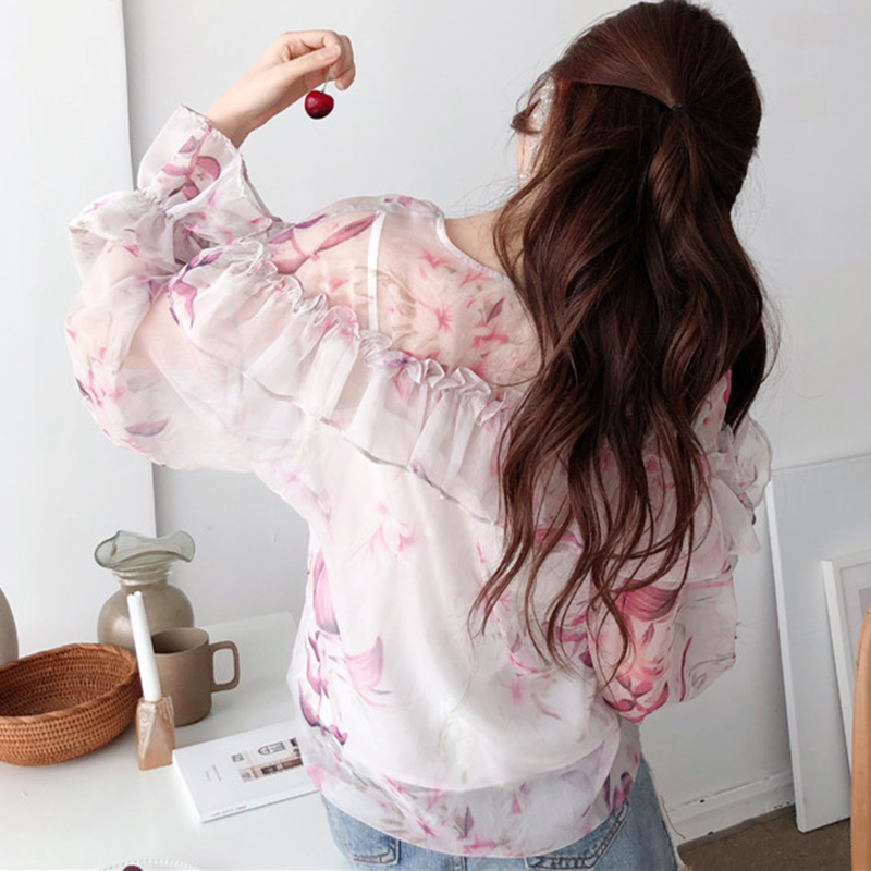 氣質套裝女2018夏季新款女裝韓版寬松顯瘦V領燈籠長袖碎花雪紡衫