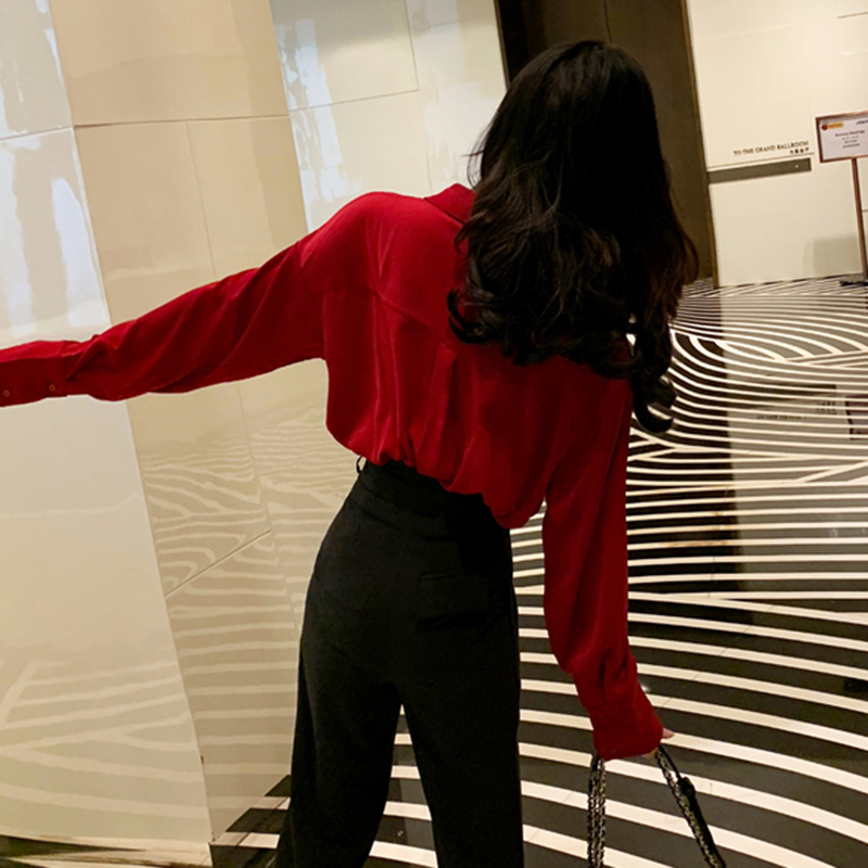 / 兩件套裝女秋冬時尚V領紅色長袖襯衫高腰顯瘦九分褲休閑西裝褲子