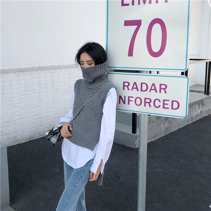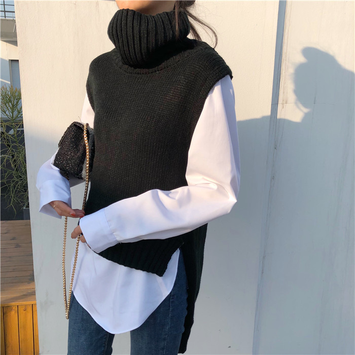 / 毛衣女2018新款時尚韓版氣質高領百搭襯衫拼接前短后長假兩件上衣