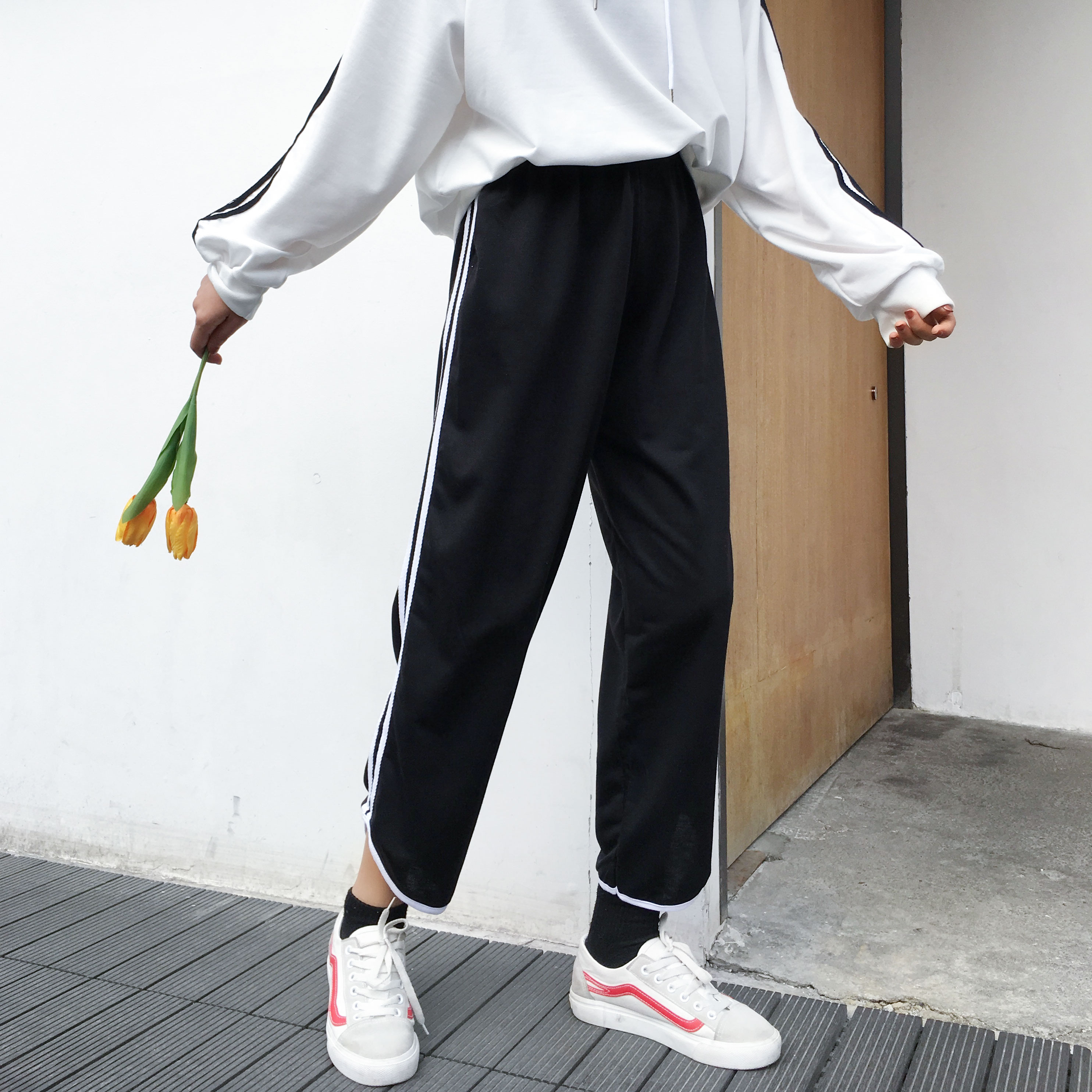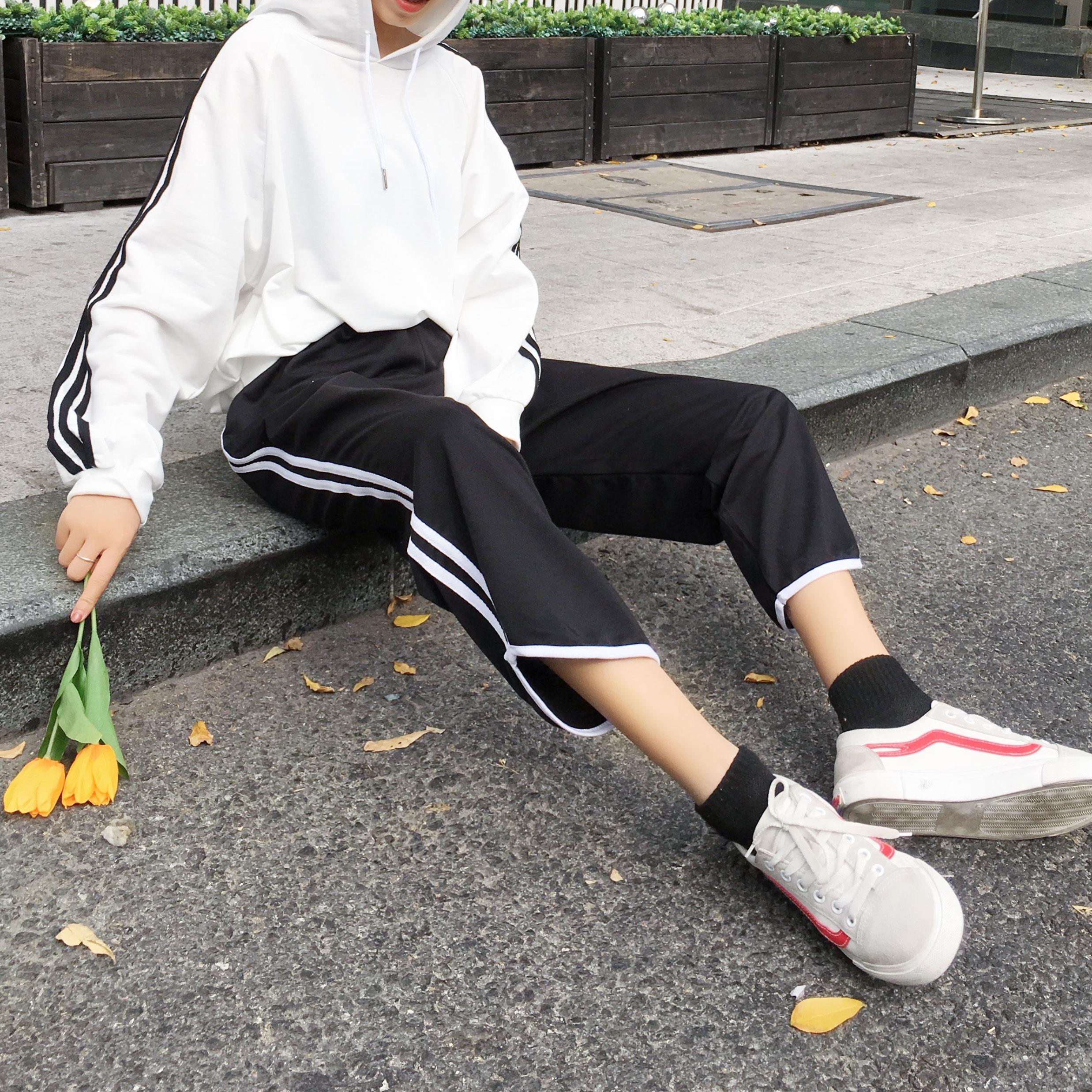 / 春季新款女裝韓版寬松側條紋休閑褲子女學生百搭顯瘦九分闊腿褲潮