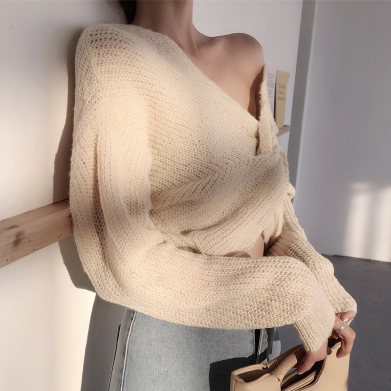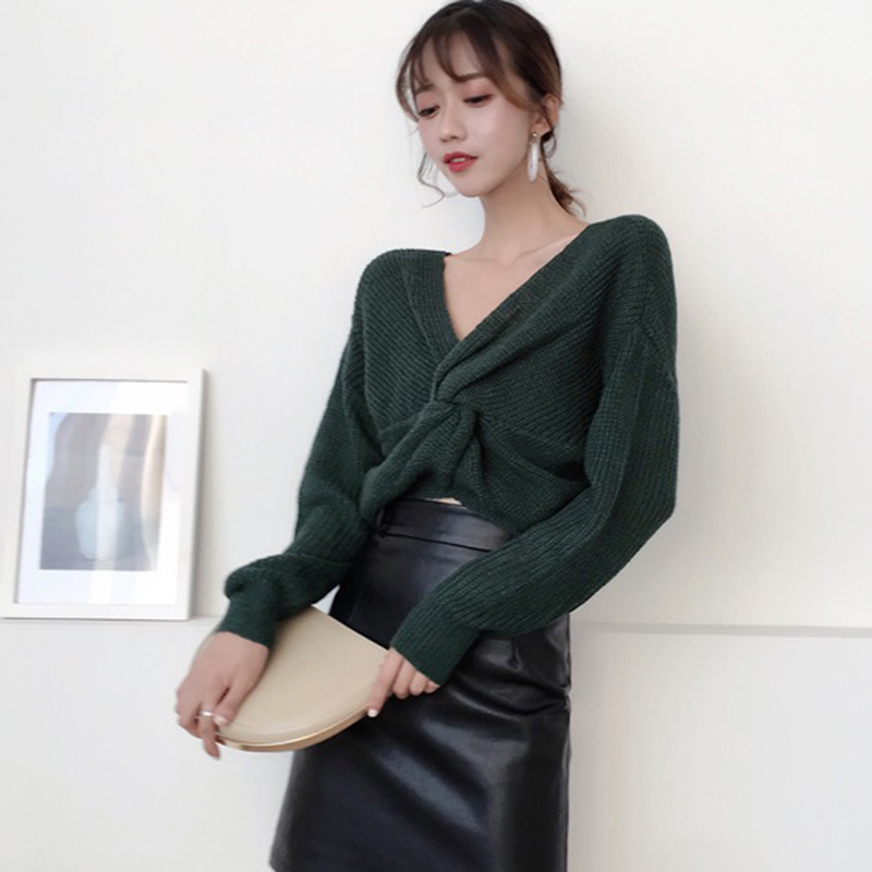 / 早秋2018新款女裝復古氣質交叉V領兩穿長袖毛衣時尚百搭修身上衣
