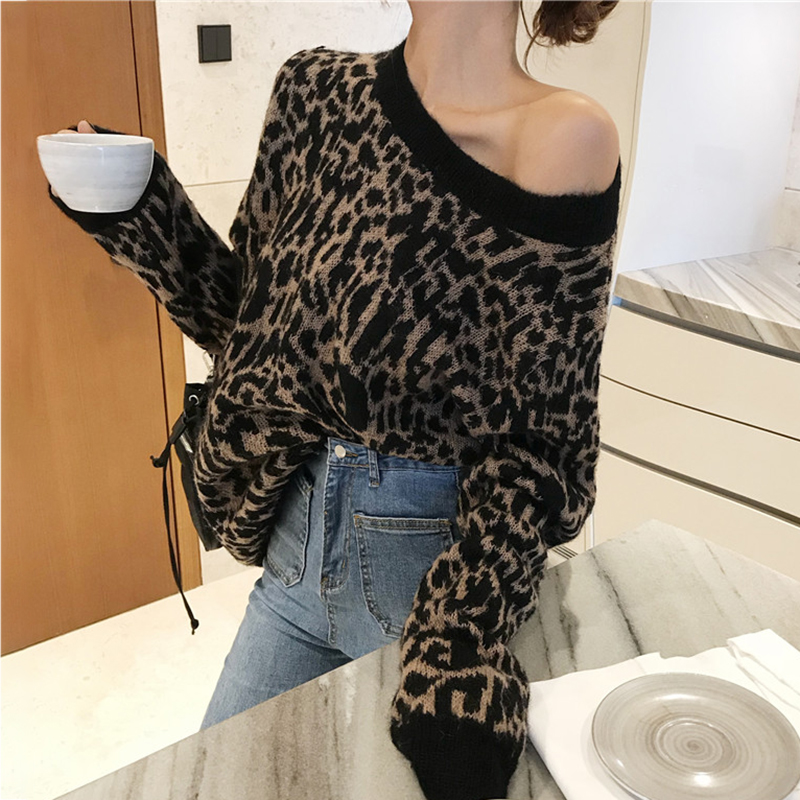 慵懶風豹紋針織衫女秋冬裝2018新款學生韓版時尚寬松長袖毛衣外套