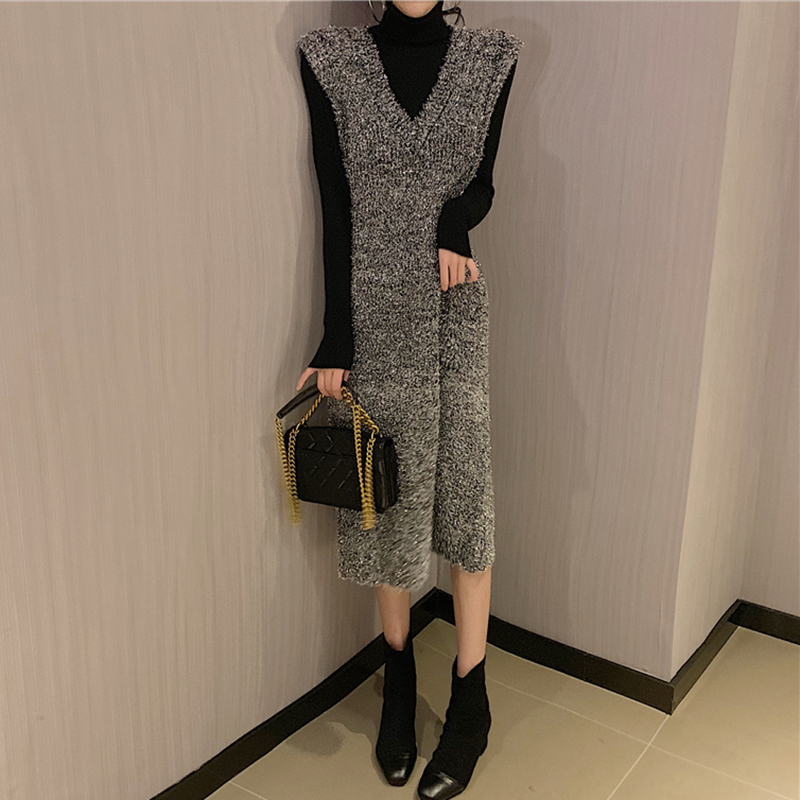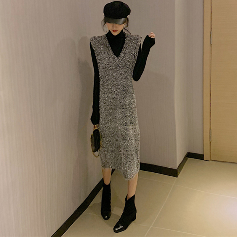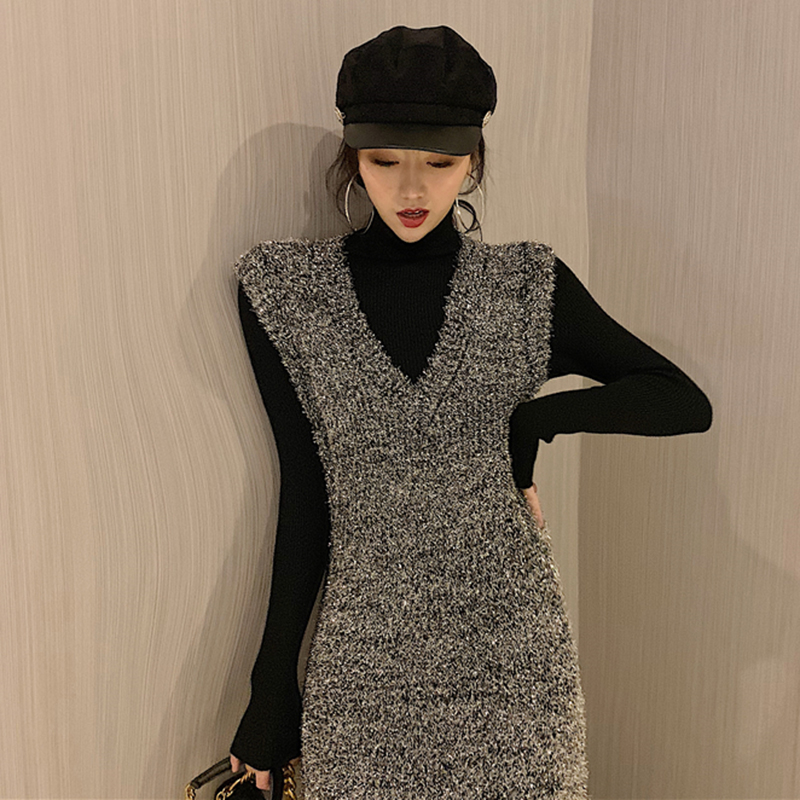 / 御姐套裝女秋冬新款亮絲V領背心連衣裙子黑色修身顯瘦針織打底衫