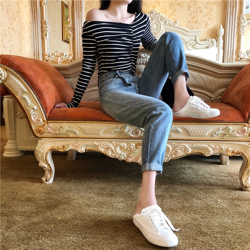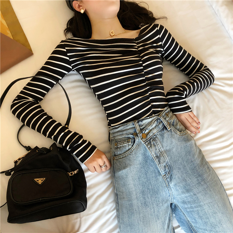 女神套裝秋兩件套條紋不規則打底衫+高腰寬松休閑不規則直筒褲潮