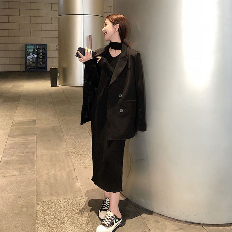 慵懶風秋裝女2018新款復古夾克牛仔外套女春秋+純色V領吊帶連衣裙