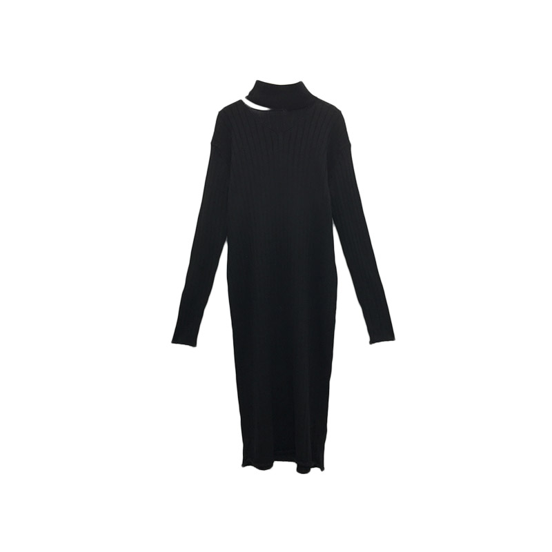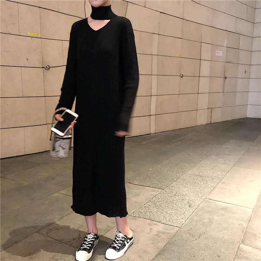 早秋中長款連衣裙秋裝2018新款女長袖黑色v領裙子設計感針織裙潮