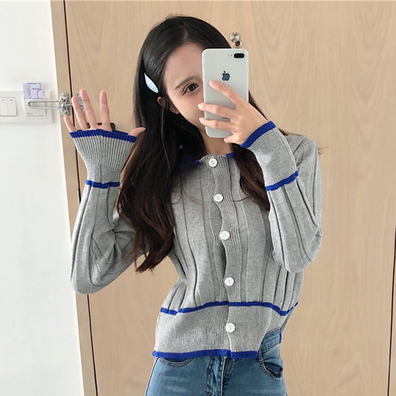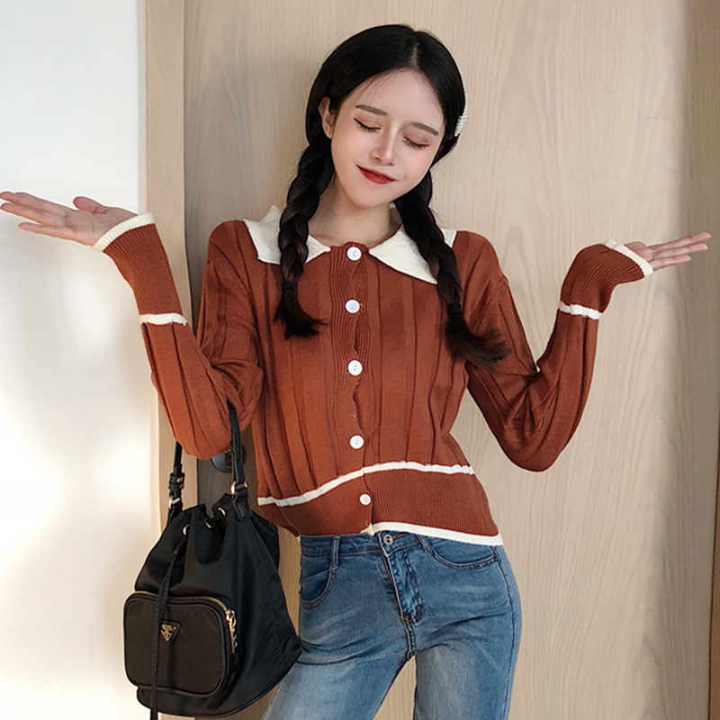 / 新款秋裝女復古修身拼色長袖毛衣時尚氣質慵懶小開衫學生打底上衣