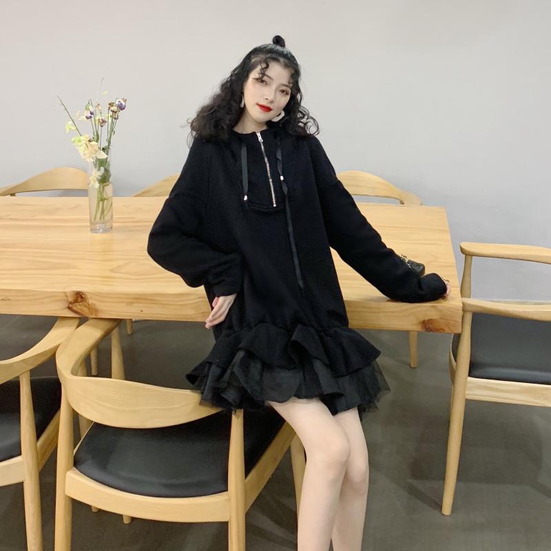 / 港味裙子女秋冬2018新款百搭帶帽加絨加厚寬松衛衣拼接網紗連衣裙
