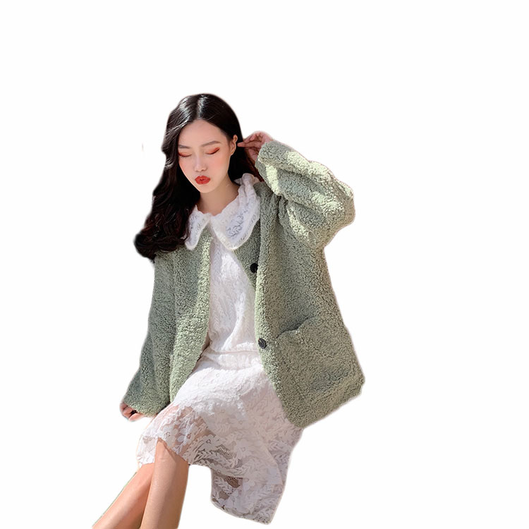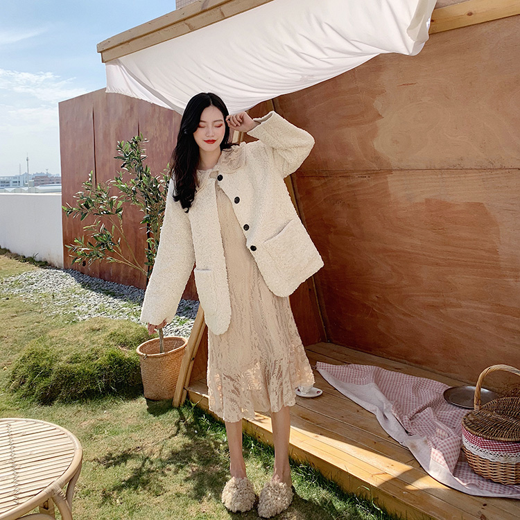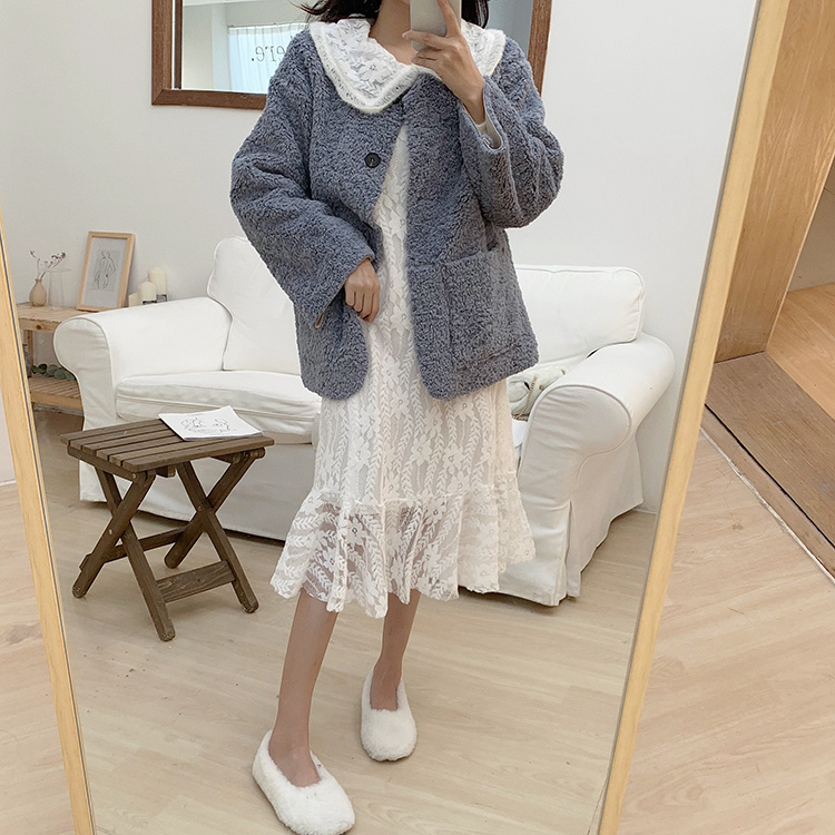 韓版女神套裝秋冬新款羊羔毛單排扣開衫外套+娃娃領蕾絲連衣裙女