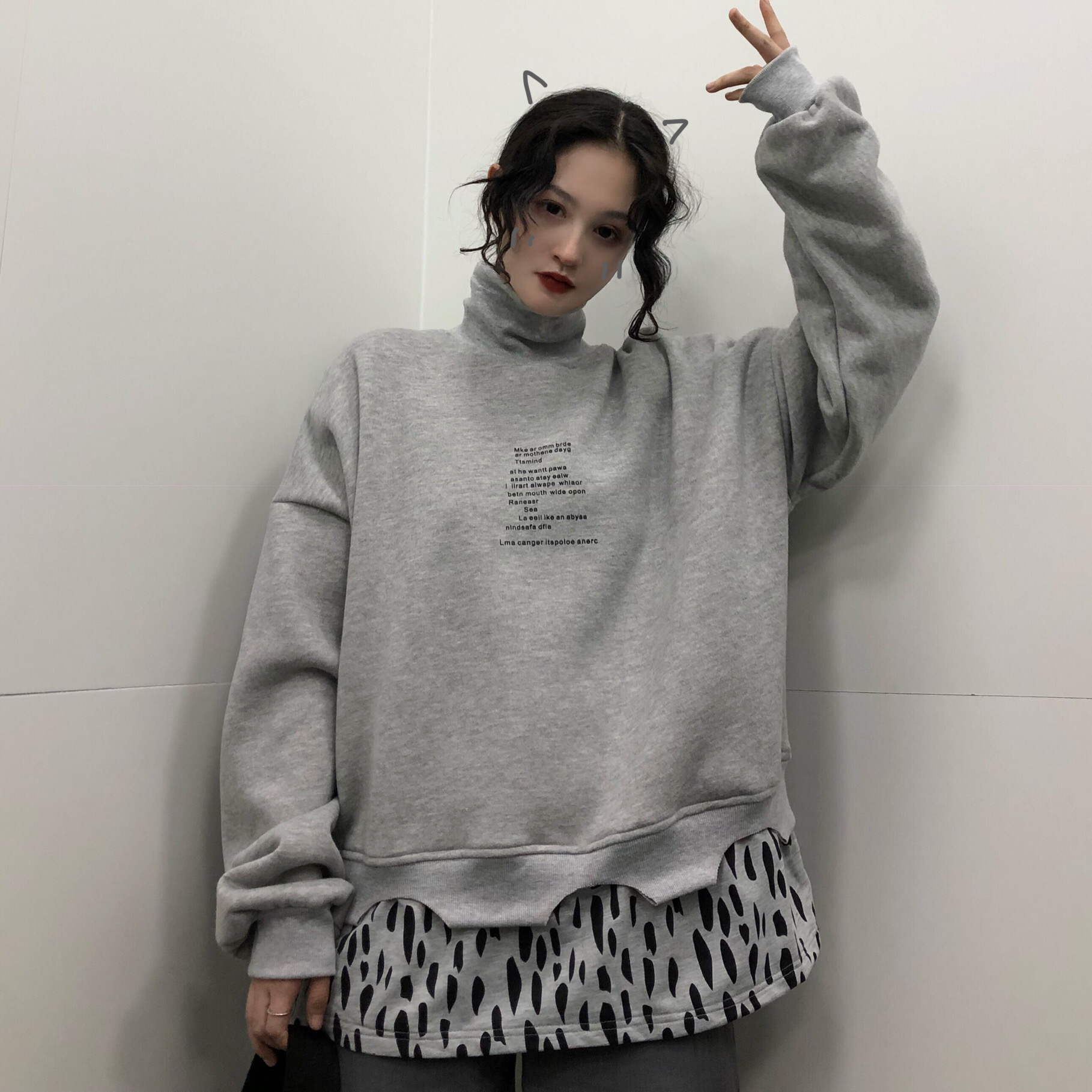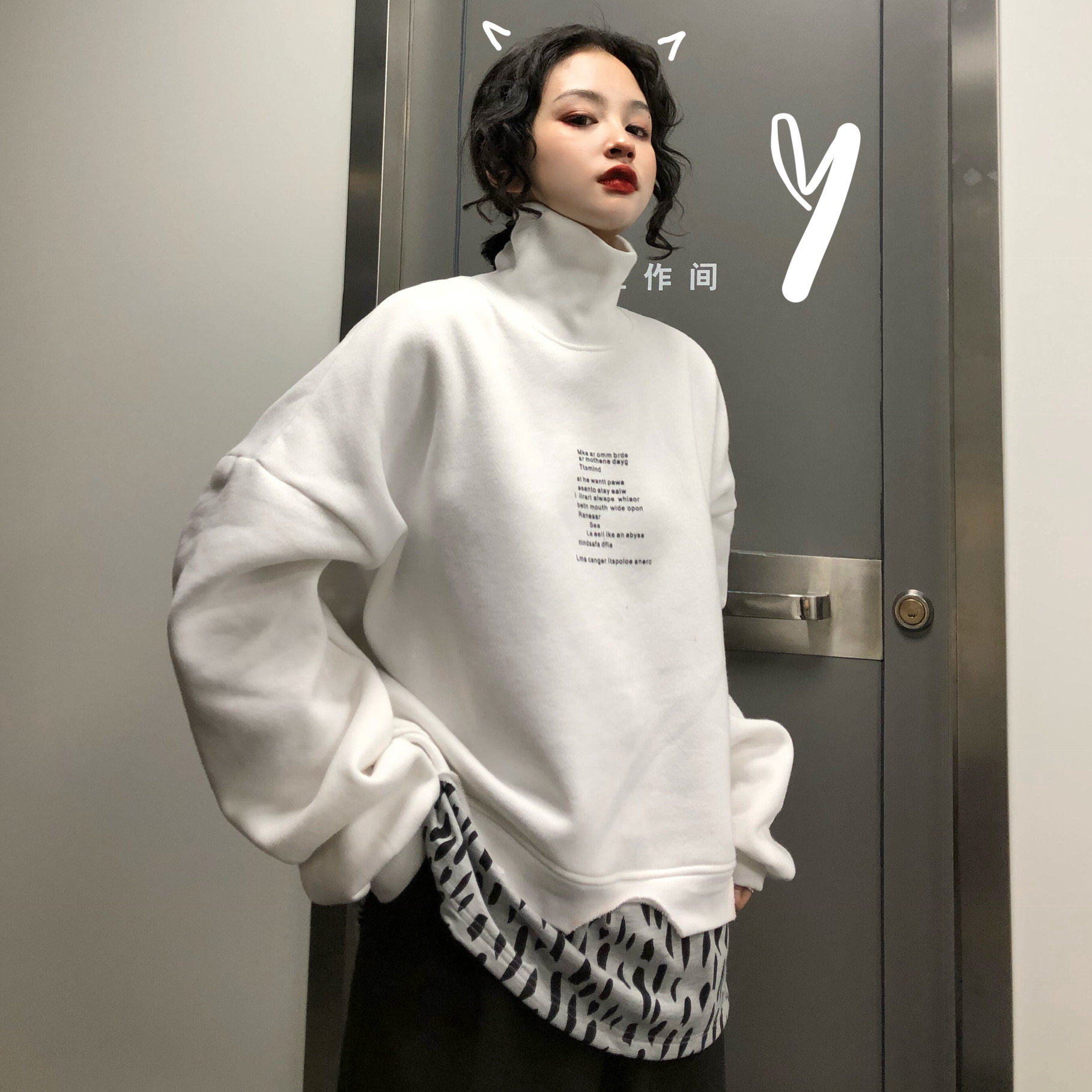 衛衣2018新款女長袖韓版寬松顯瘦oversize印花半高領慵懶長款裙子