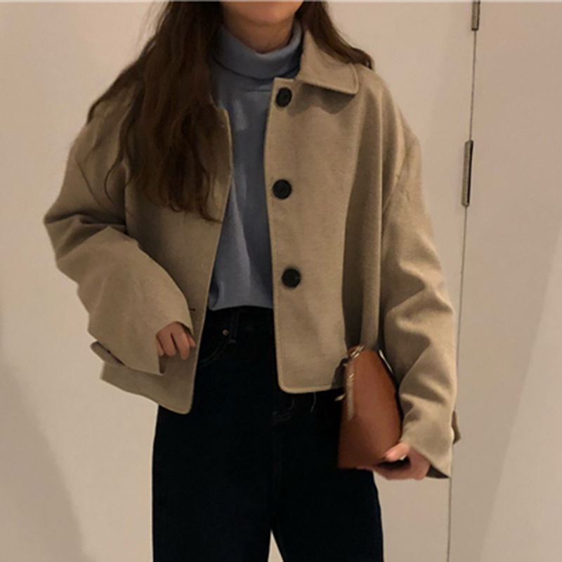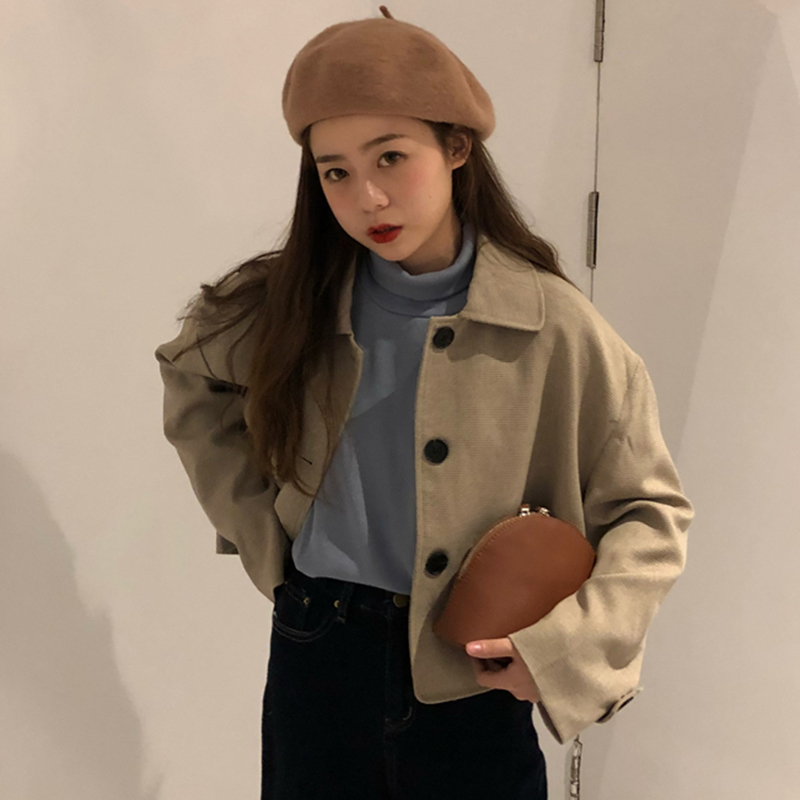 復古翻領短外套秋冬女裝2018新款港風小個子寬松開衫休閑長袖上衣