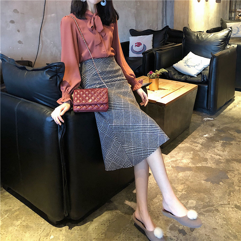 時尚顯瘦一步裙高腰格子半身裙女2018新款復古韓國中長款包臀裙子