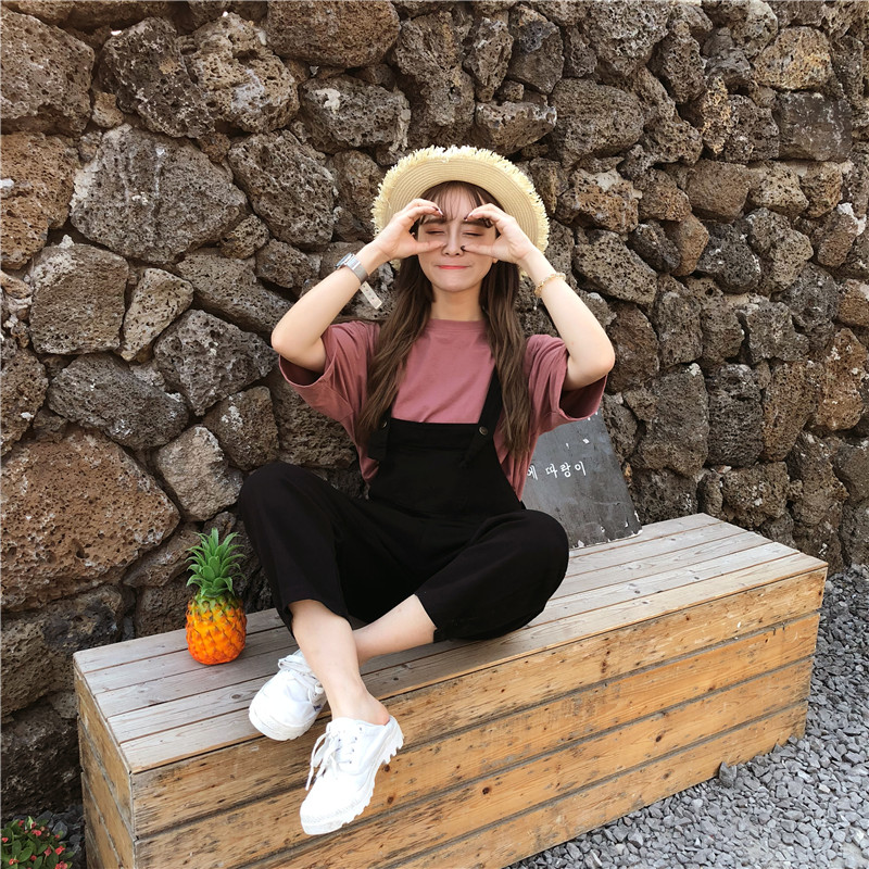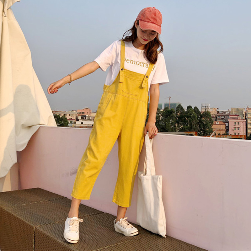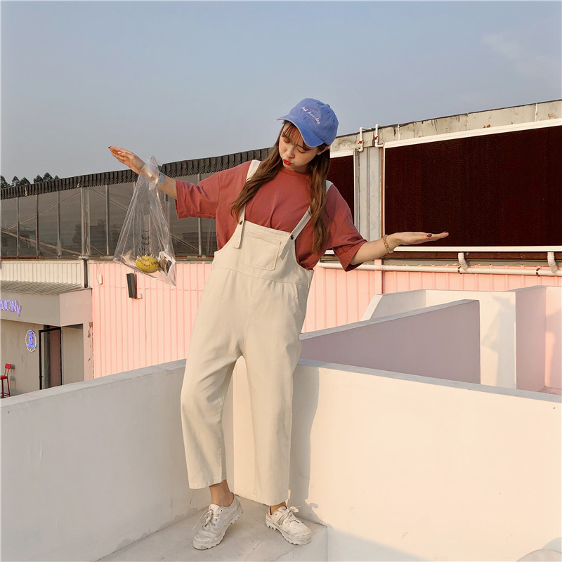 / 夏季新款女裝學院風百搭寬松顯瘦工裝學生休閑直筒九分背帶褲女