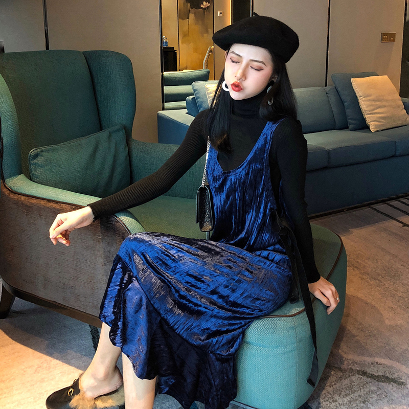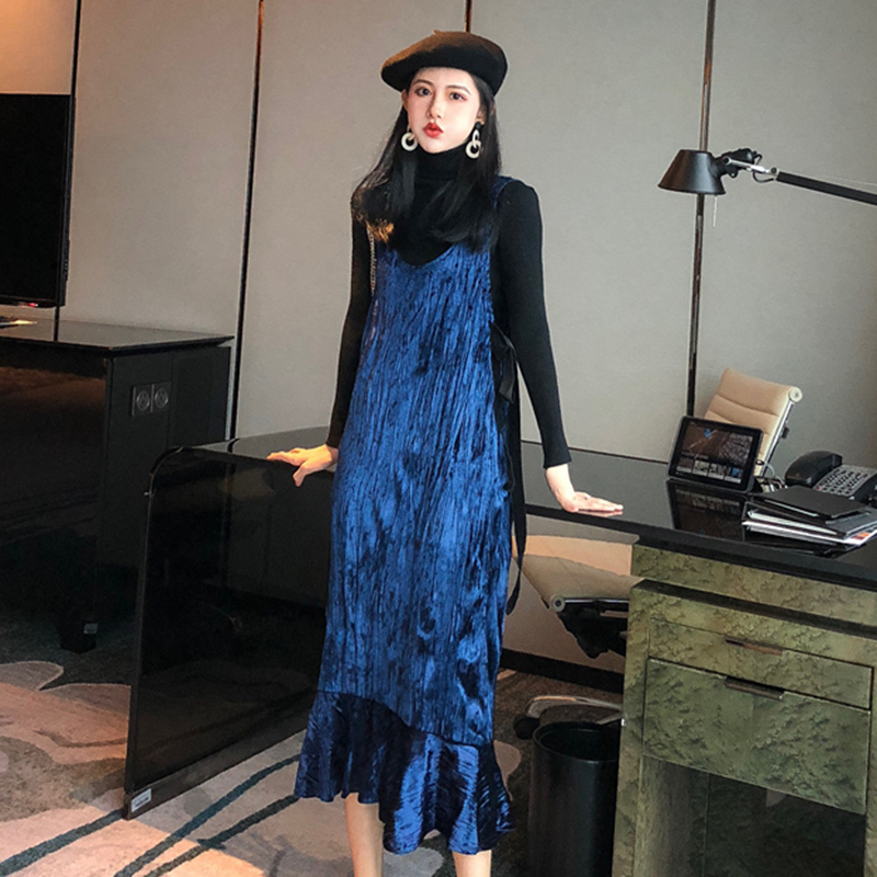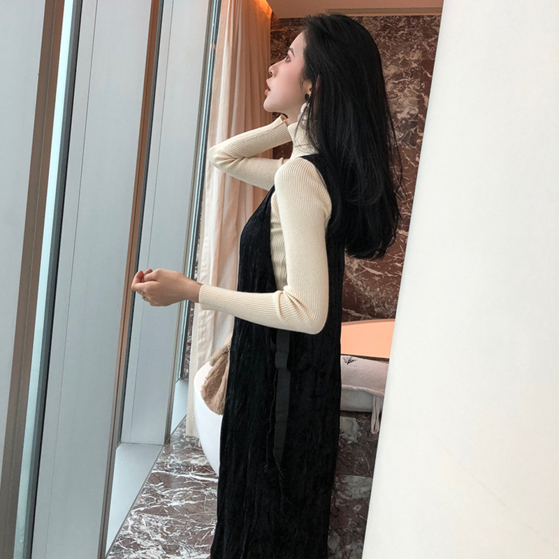 女神套裝秋2018新款修身高領打底上衣氣質荷葉邊中長背心連衣裙子
