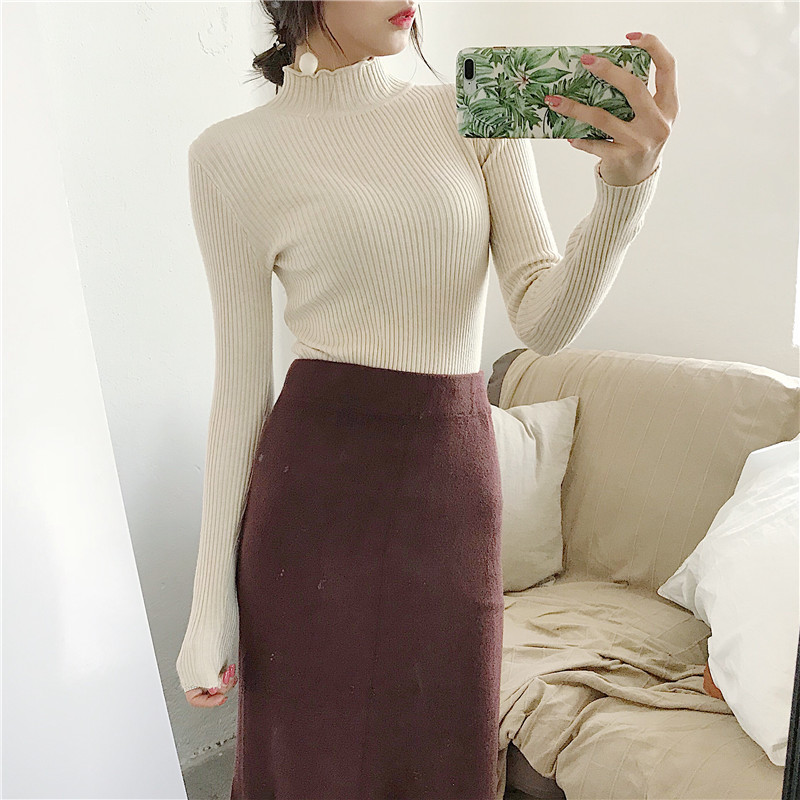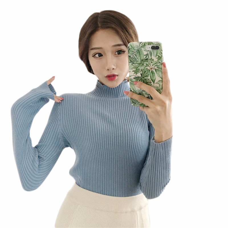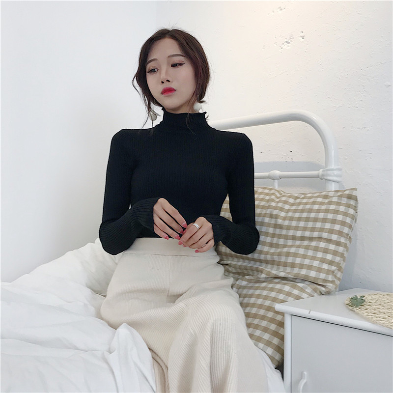 港味女裝上衣2018新款復古修身顯瘦百搭半高領純色長袖針織打底衫
