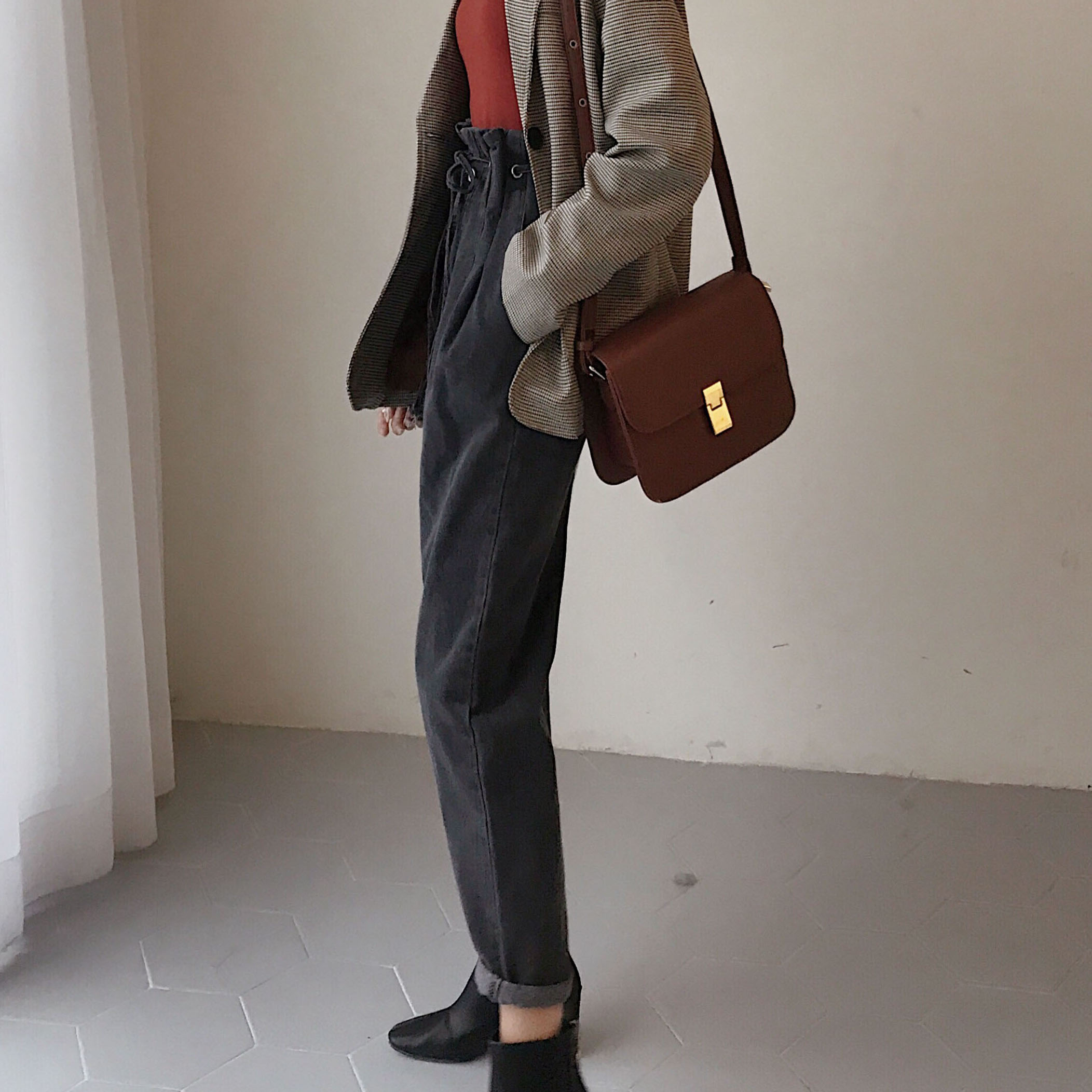 港味復古高腰系繩牛仔褲女秋冬2018新款寬松顯瘦百搭老爹褲蘿卜褲