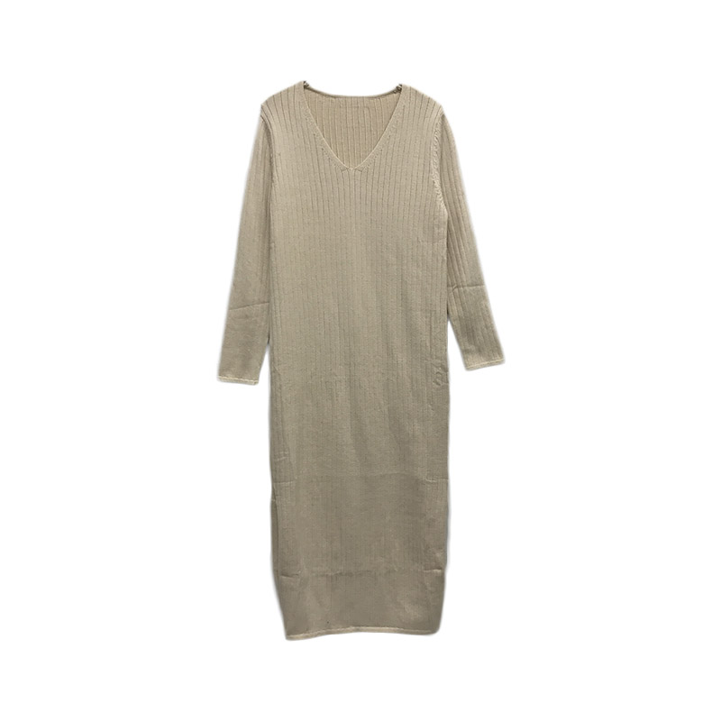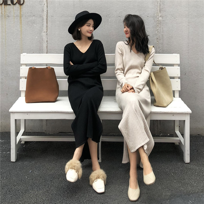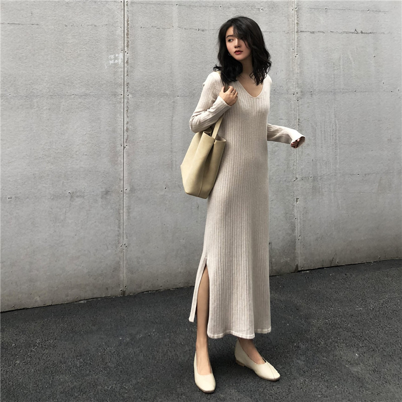 韓版坑條針織長款v領寬松連衣裙女秋冬2018新款側開叉打底裙女潮