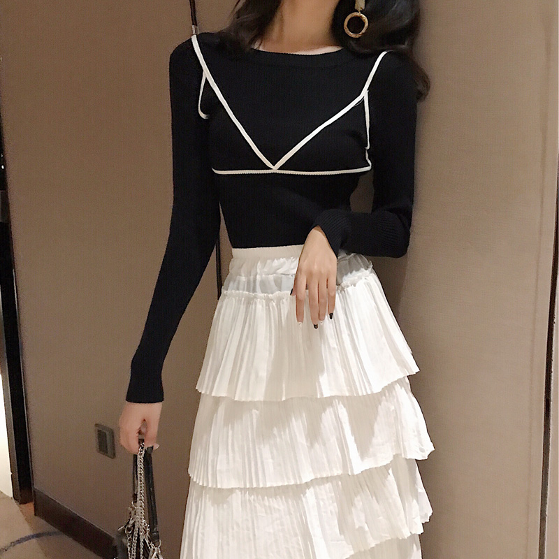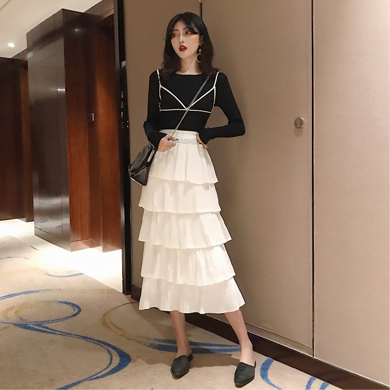 秋裝女2018新款套裝修身顯瘦針織衫長袖+中長款百褶蛋糕裙兩件套