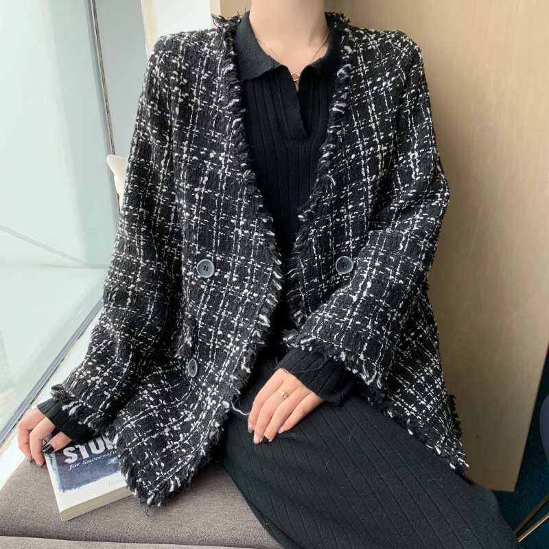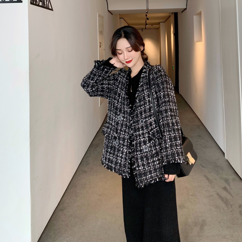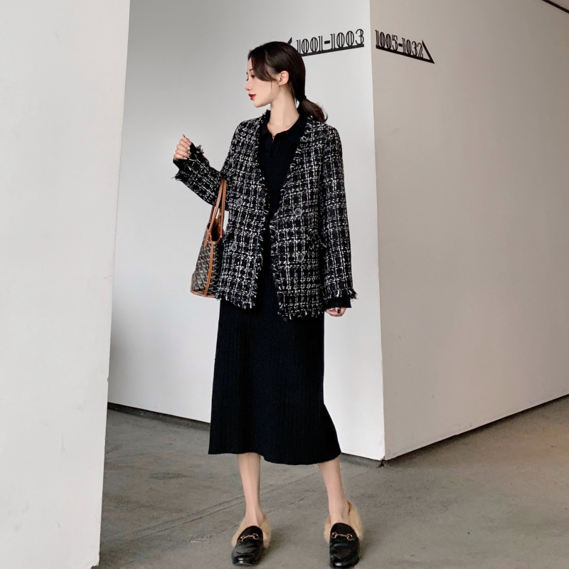 粗花呢小香風毛呢秋冬短款流蘇外套女+中長款復古長袖打底裙套裝