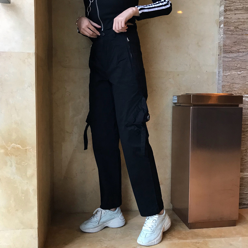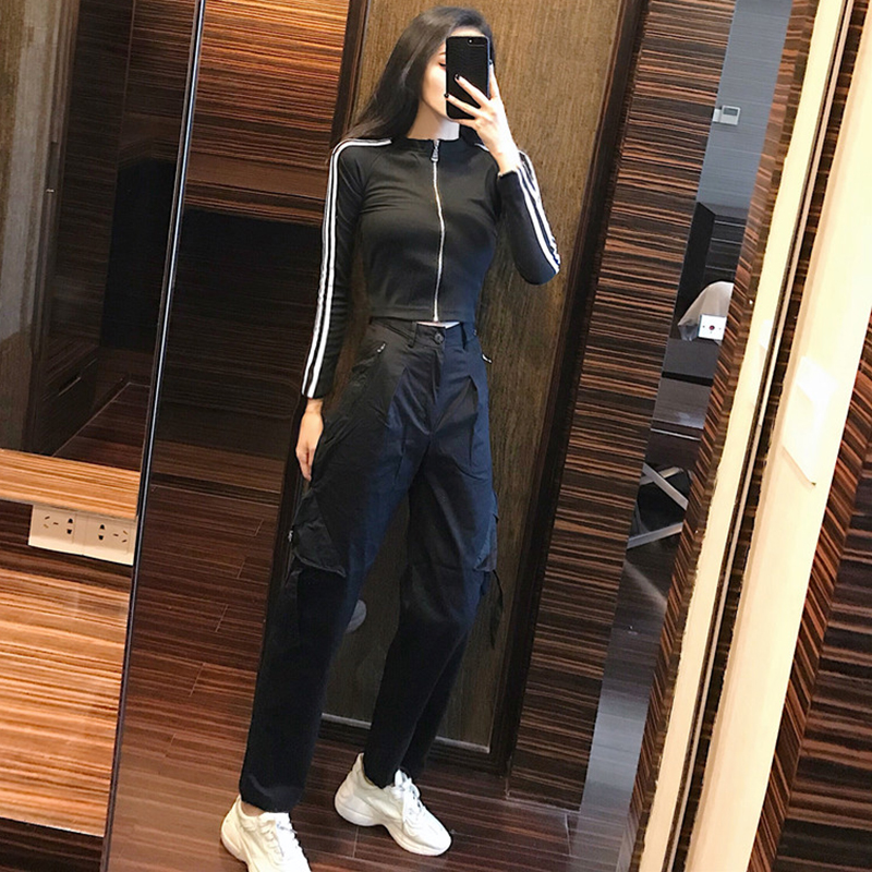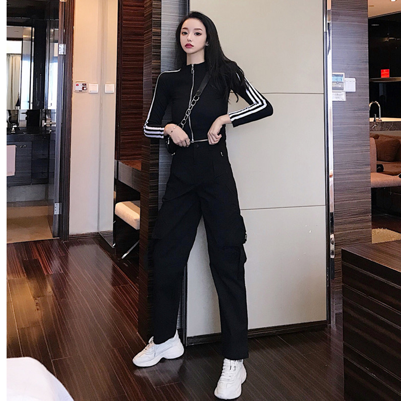 運動套裝女秋冬新款學生黑色直筒休閑褲子條紋長袖時尚外套上衣潮