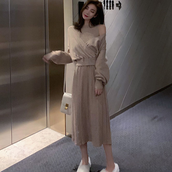 / 復古韓國chic風V領蝙蝠袖短款毛衣女2018新款+百褶針織背心連衣裙
