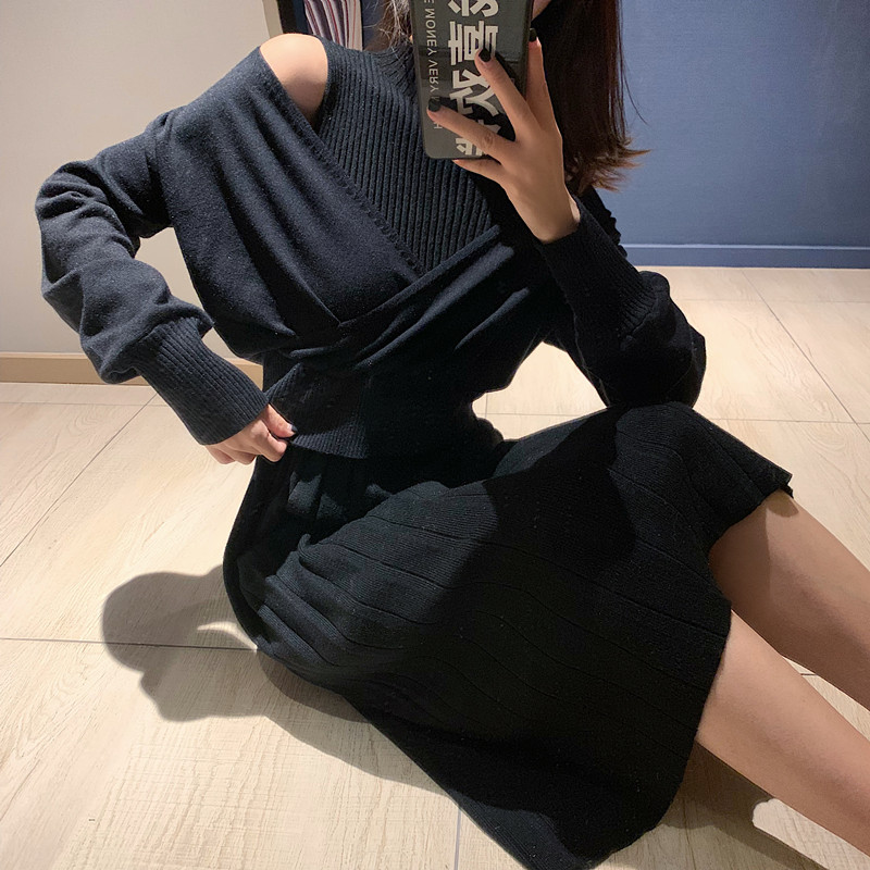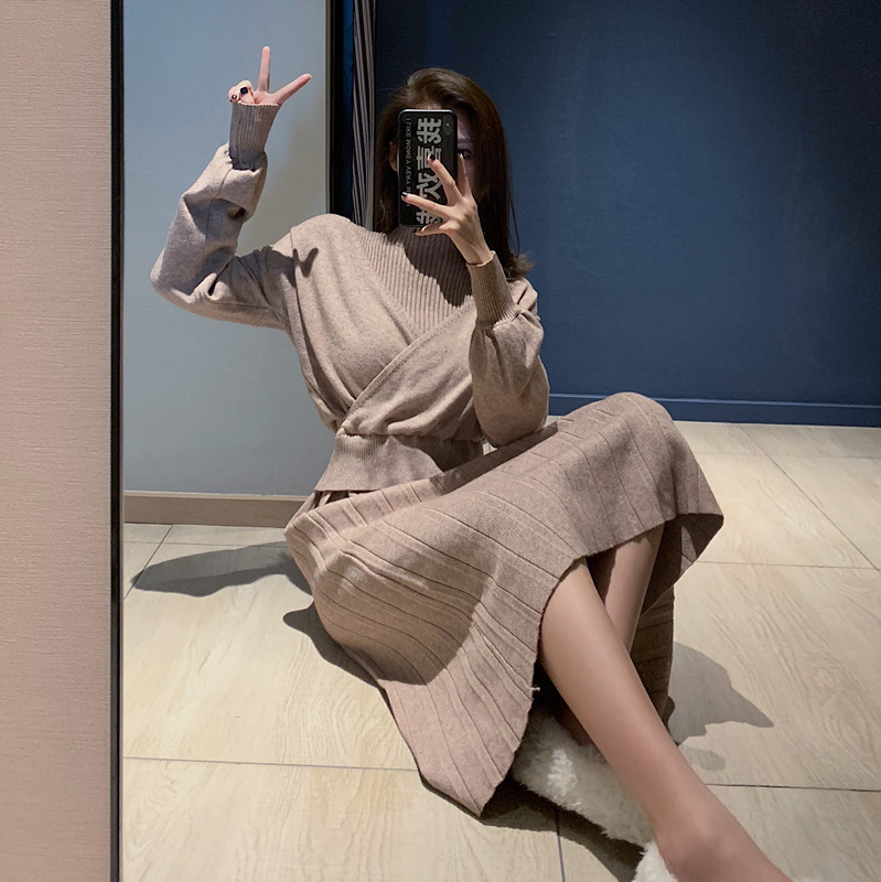 馬海毛網紅毛衣女2018新款針織開衫外套冷淡風針織吊帶連衣裙套裝