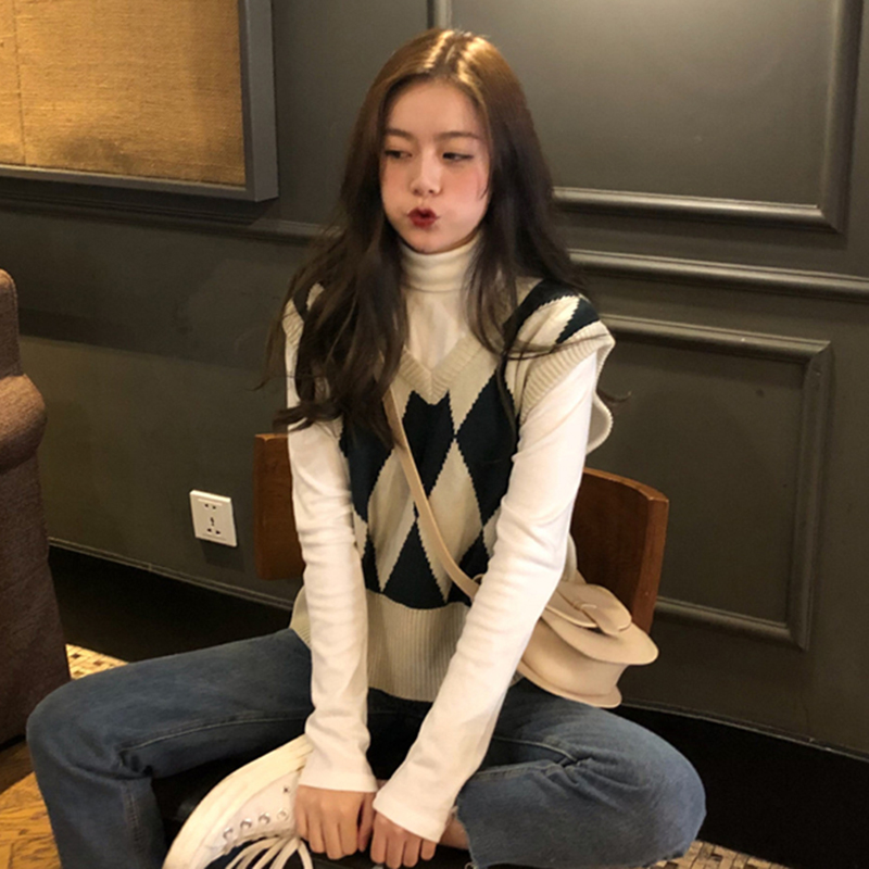 秋裝女2018新款拼色菱格無袖馬甲背心高領長袖打底衫修身上衣套裝