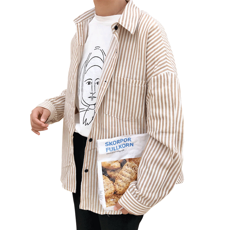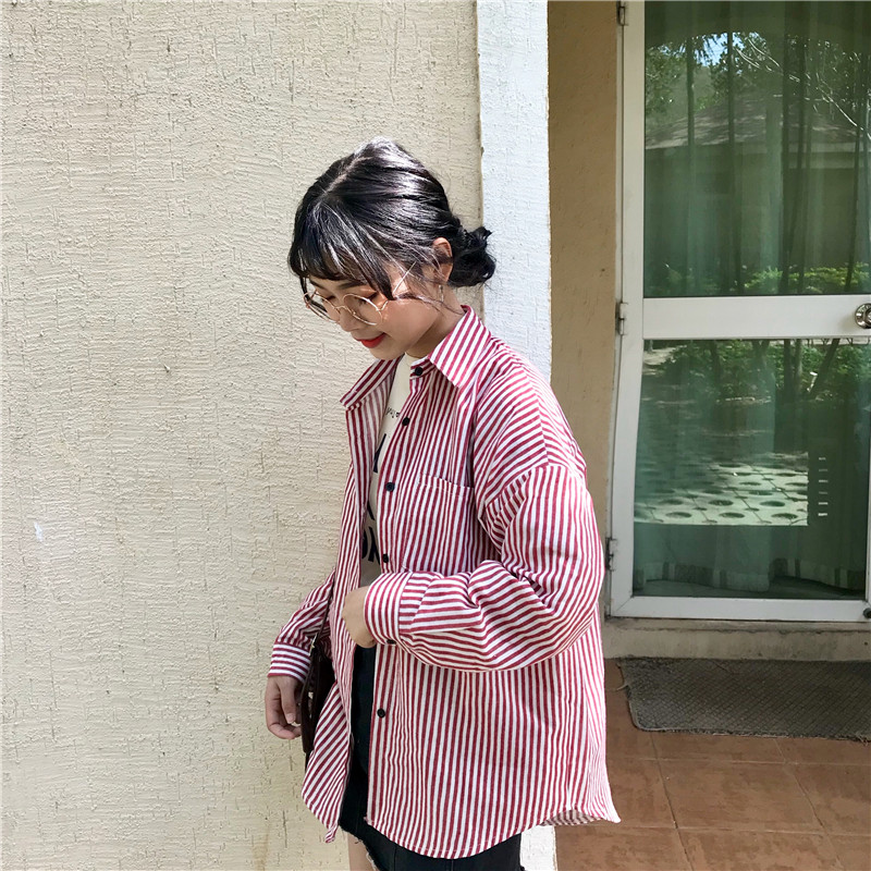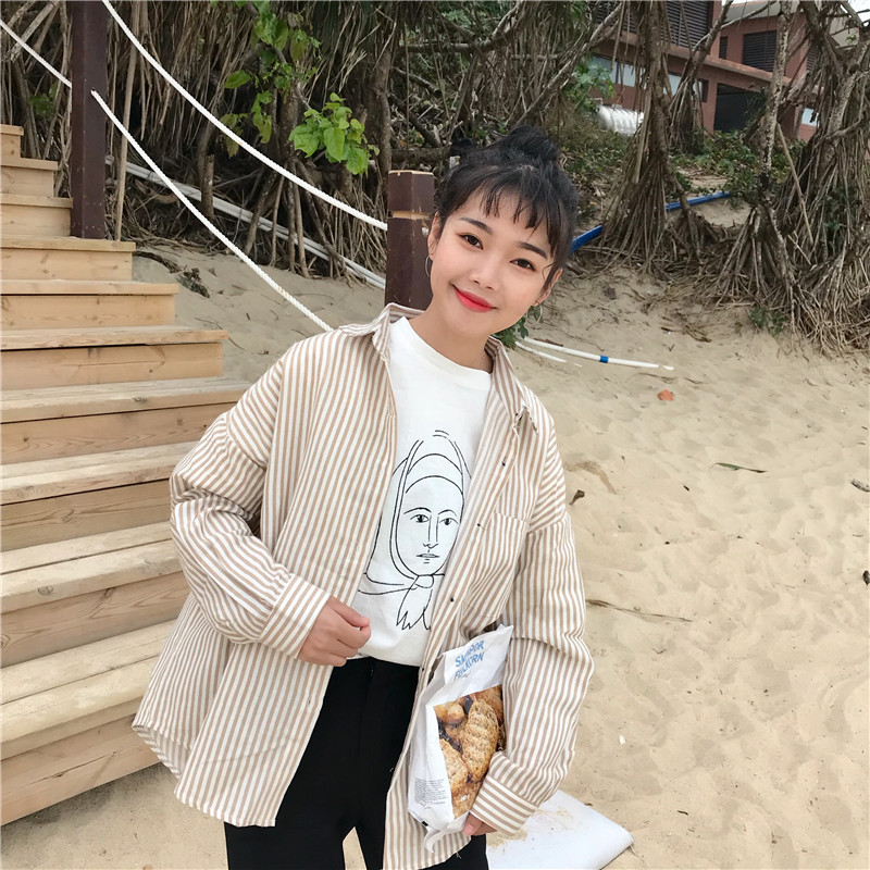 / 早春新款女裝簡約百搭拼色條紋寬松顯瘦學生長袖襯衣開衫外套女