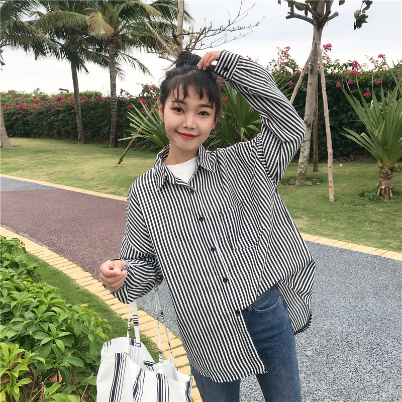 早春新款女裝簡約百搭拼色條紋寬松顯瘦學生長袖襯衣開衫外套女