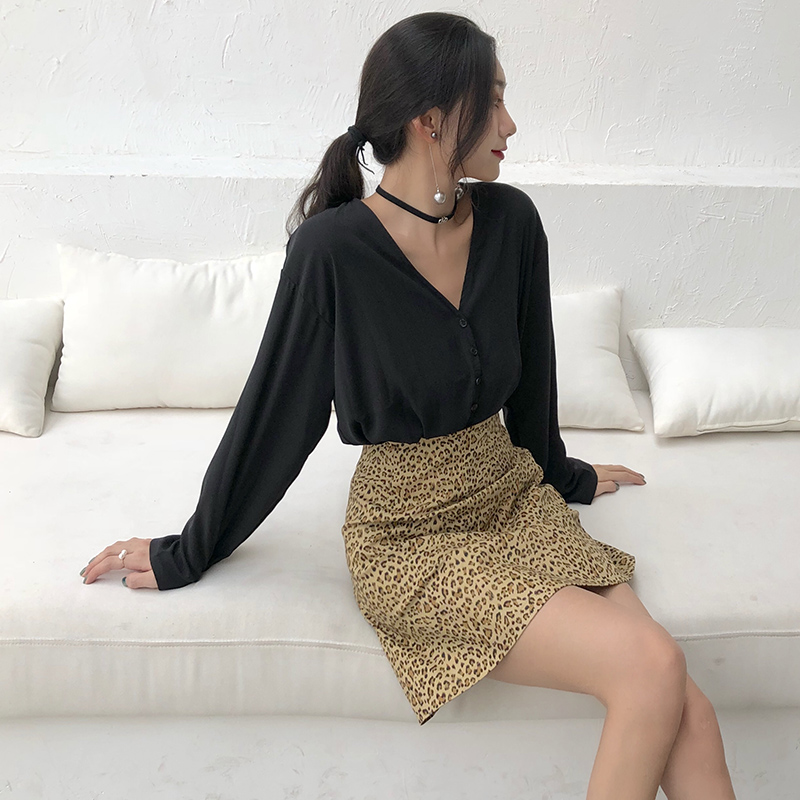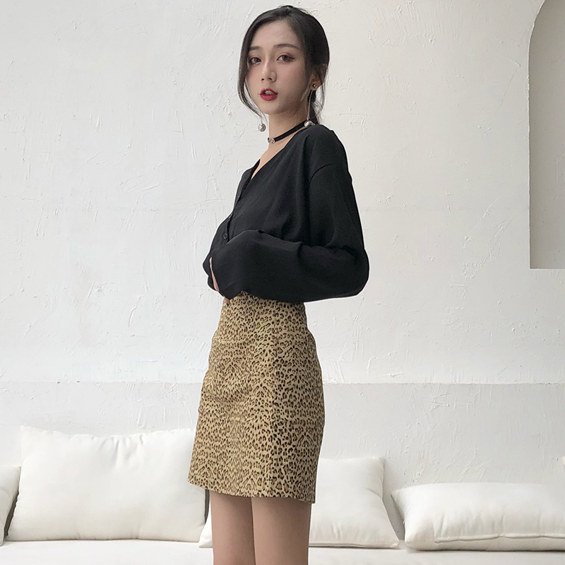 / 時尚套裝夏2018新款女裝寬松復古V領雪紡上衣+豹紋半身短裙倆件套