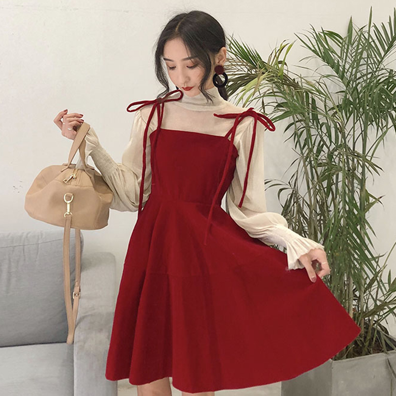 / 時尚套裝女秋冬2018新款高領網紗打底衫高腰黑色吊帶A字連衣裙子