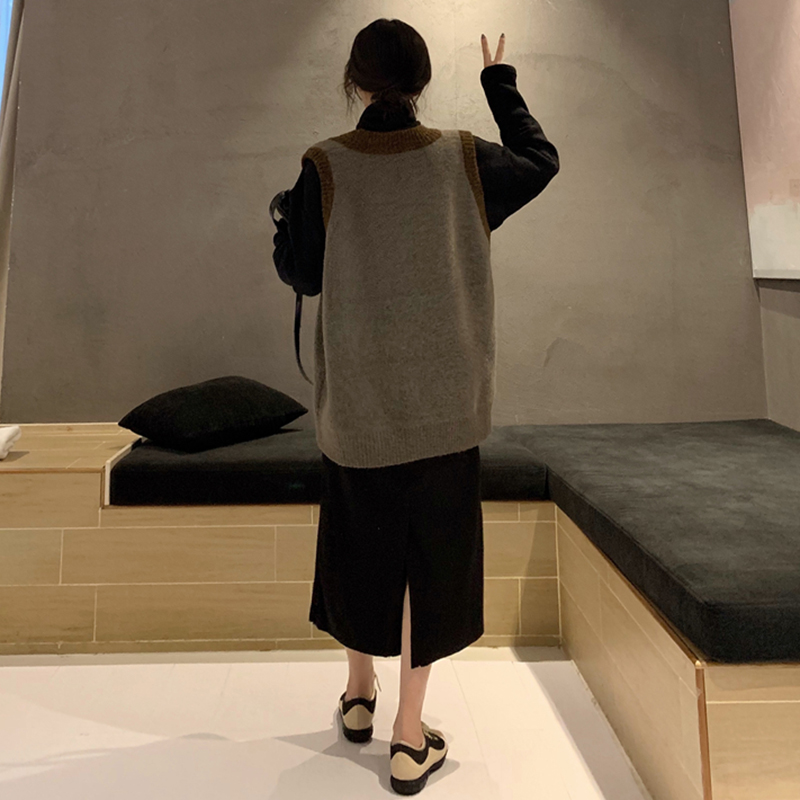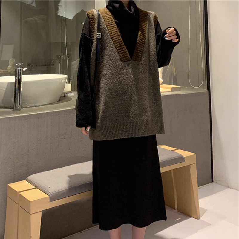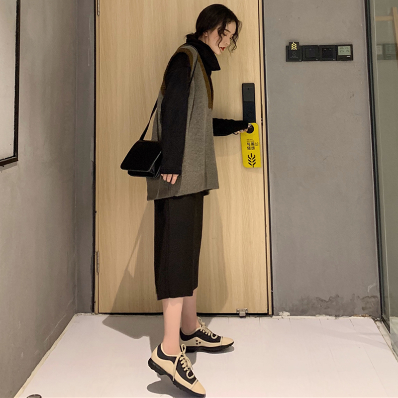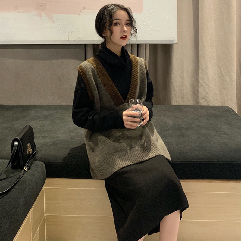 / 套裝女秋冬新款拼色V領毛衣馬甲高領修身針織打底衫毛呢半身裙子