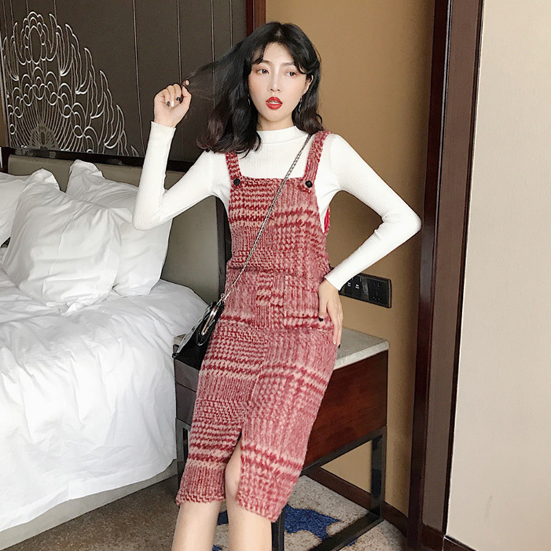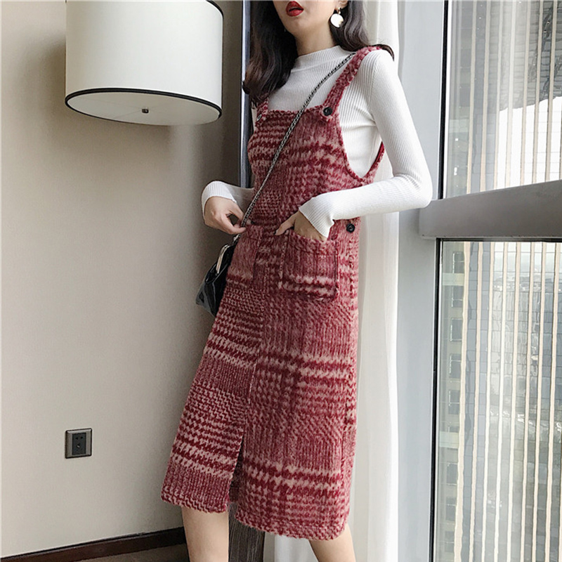 / 秋冬女裝2018新款開叉復古法式格子毛呢中長裙學生休閑背帶連衣裙